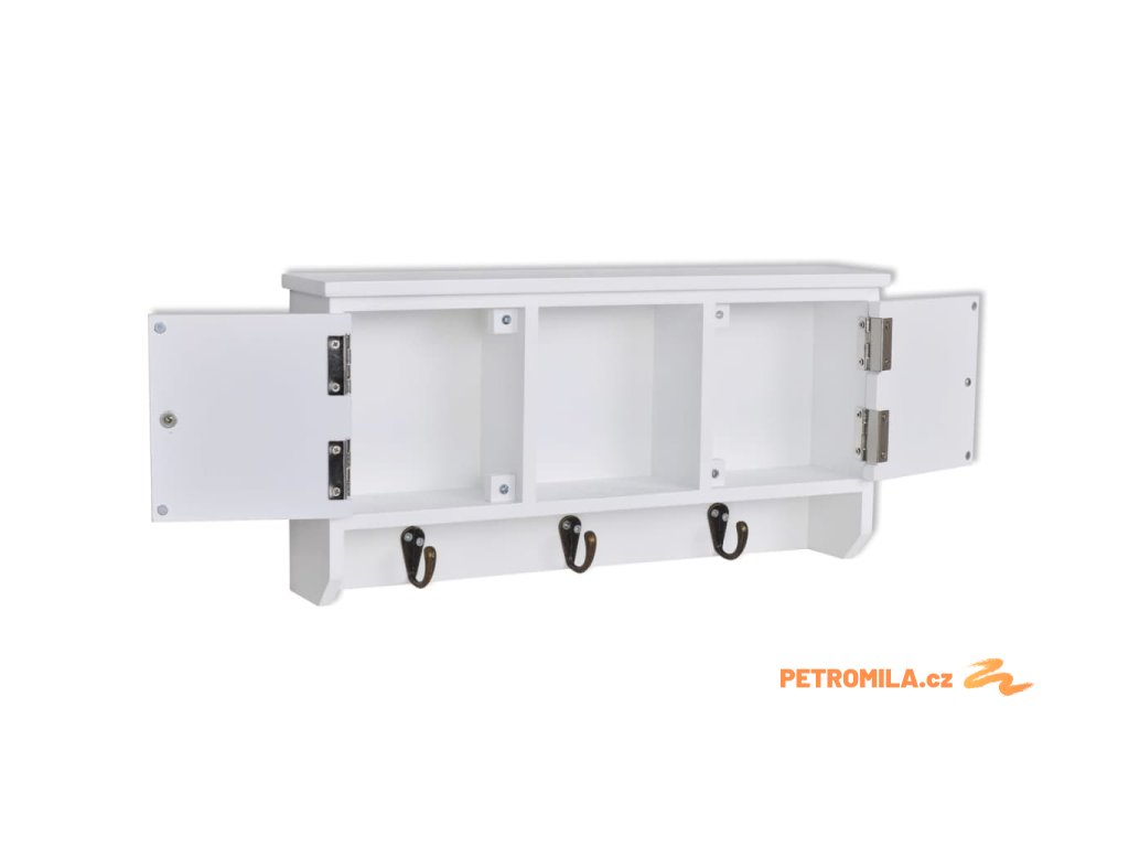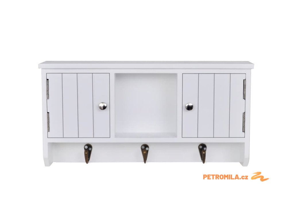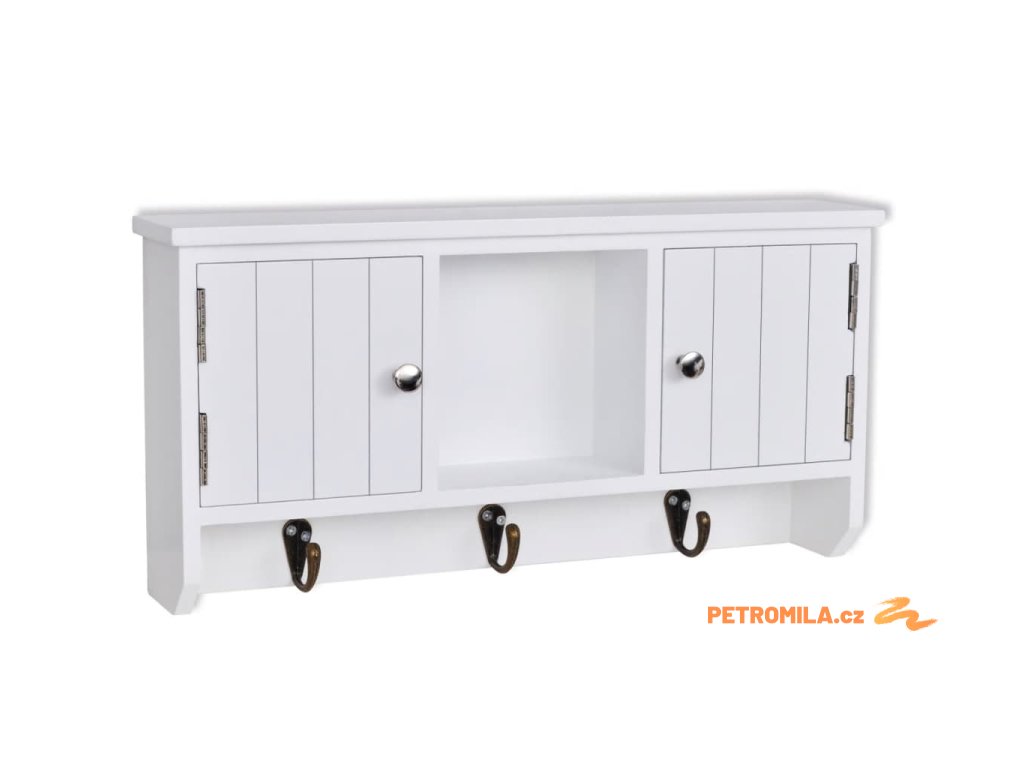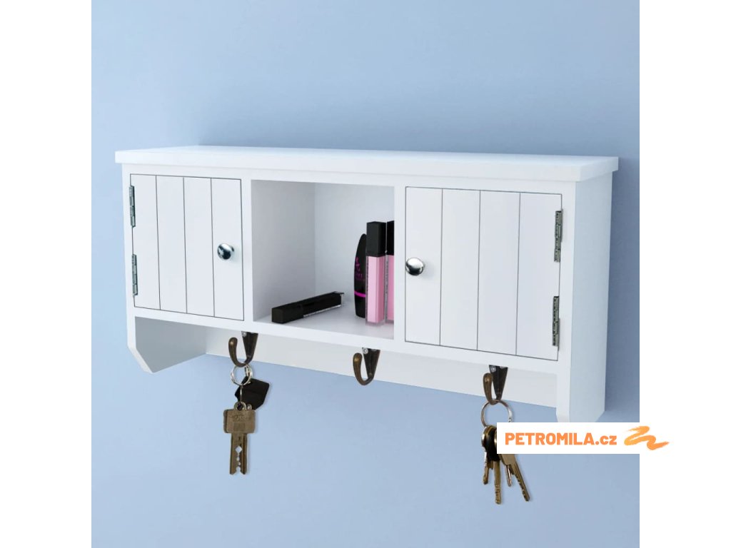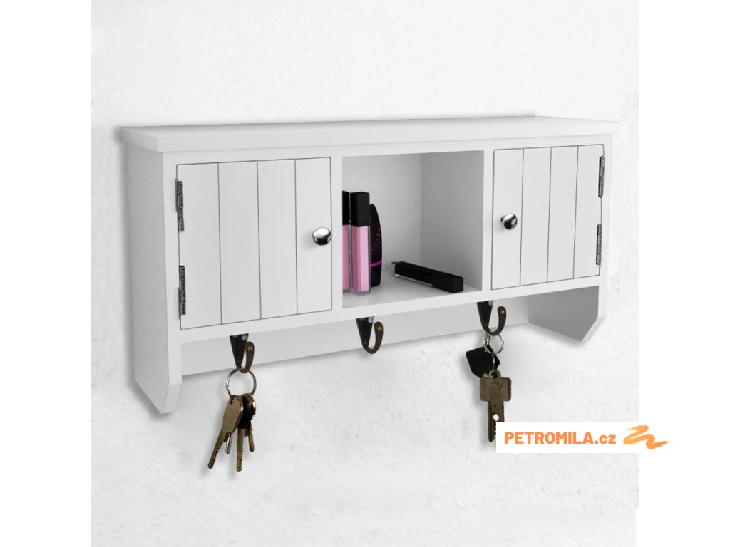 Nástěnná skříňka je opatřena třemi kovovými háčky pro zavěšení klíčů. Dvě přihrádky s dvířky a středová police poskytují dostatek prostoru pro uložení peněženek, mobilních telefonů, slunečních brýlí, šperků nebo jiných doplňků.
