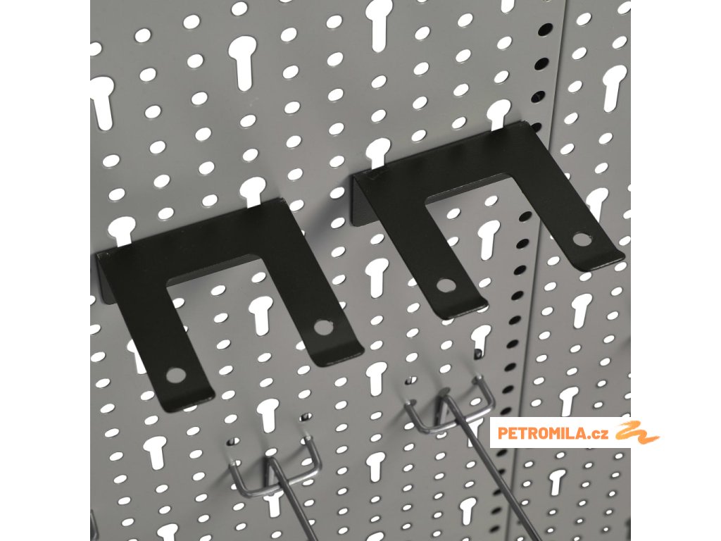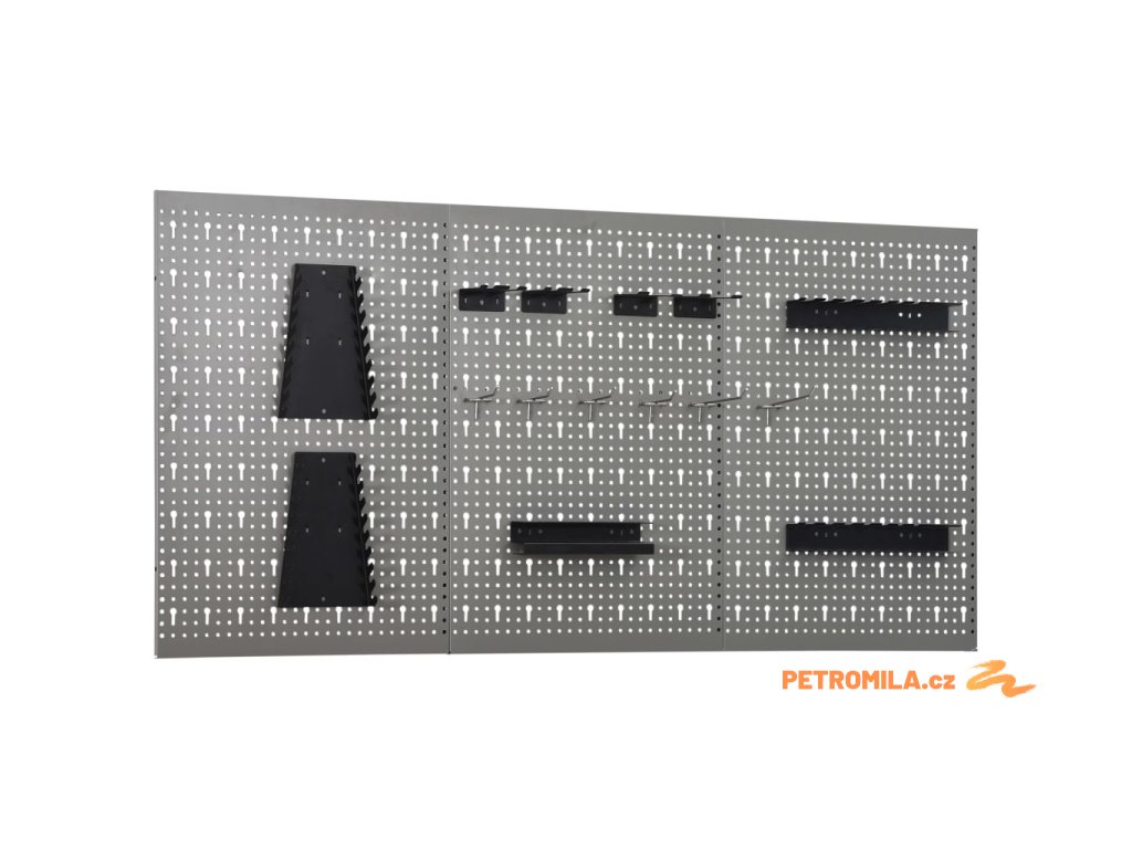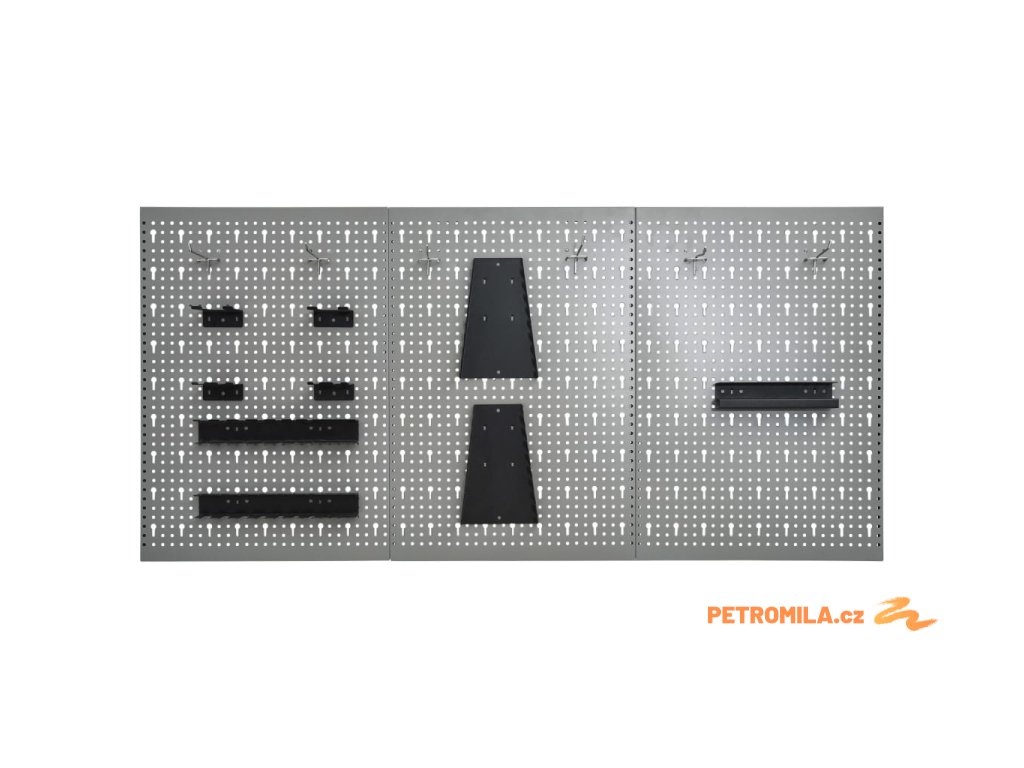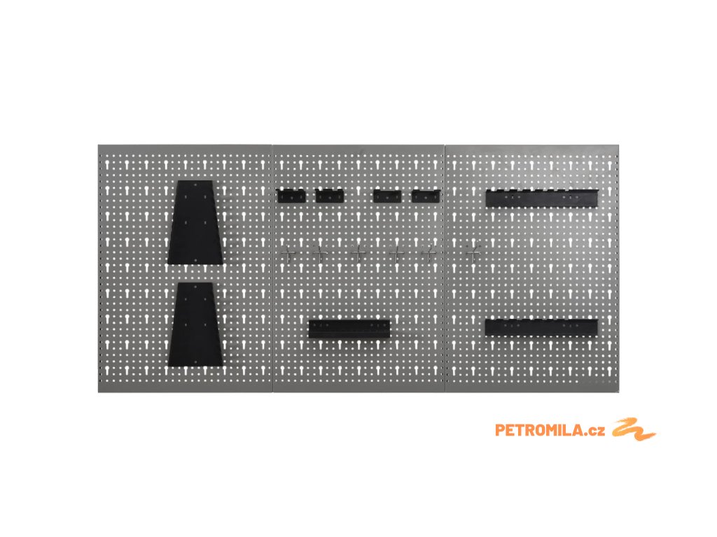 Tyto panely do dílny na nářadí jsou vyrobené z masivní oceli a unesou váhu celé řady různých nástrojů, jako jsou vrtačky, kleště, šroubováky a klíče. Panely jsou děrované pro snadné a bezpečné zavěšení nástrojů. Tyto 3 nástěnné panely je možné spojit dohromady a vytvořit jeden velmi pevný celek. Je to ideální doplněk ponků a dílenských skříní s praktickou šířkou 120 cm.