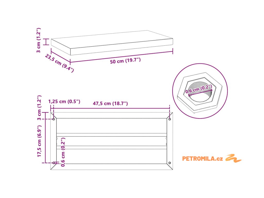 - Rozměry: 50 x 23,5 x 3 cm (D x Š x T)
