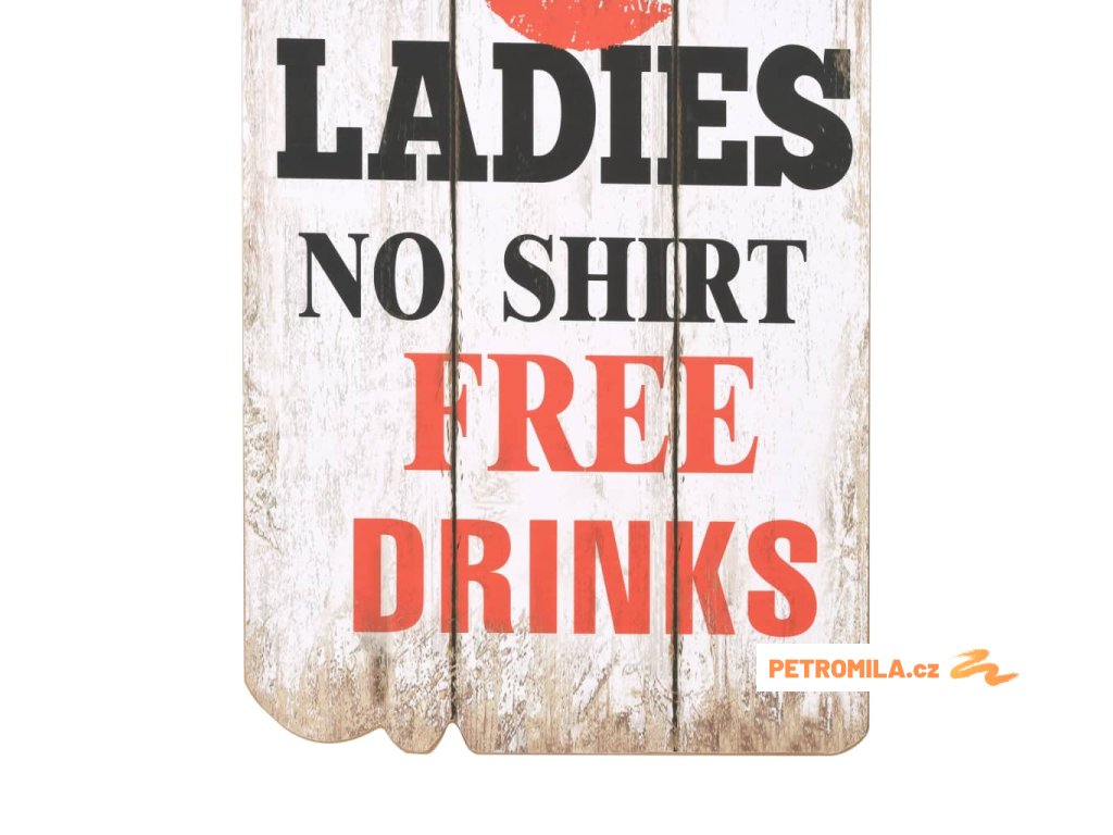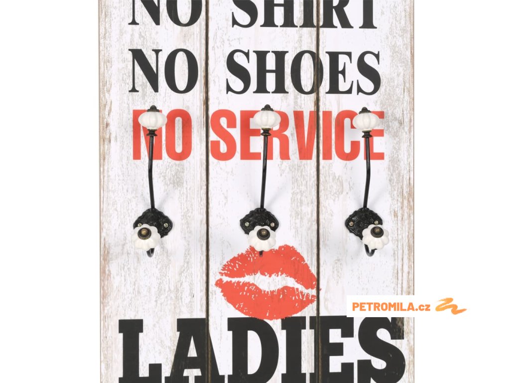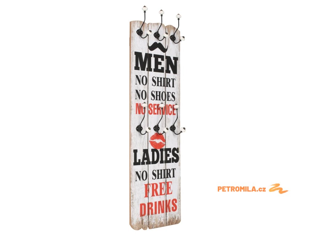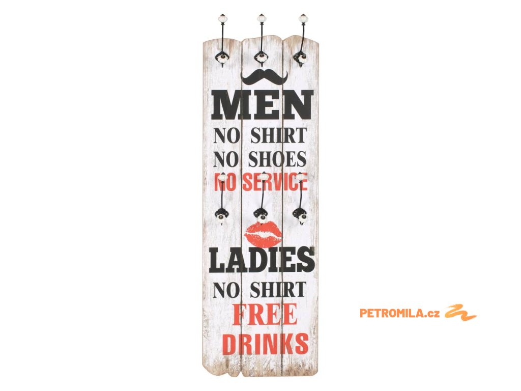 Tento nástěnný věšák s 6 háčky vaše hosty okamžitě na první pohled zaujme svým nápisem ve vintage stylu, jenž říká „Men no shirt no shoes no service ladies no shirt free drinks.“ (Pánové bez trička a bez bot bez obsluhy, dámy bez trička pití zadarmo.)