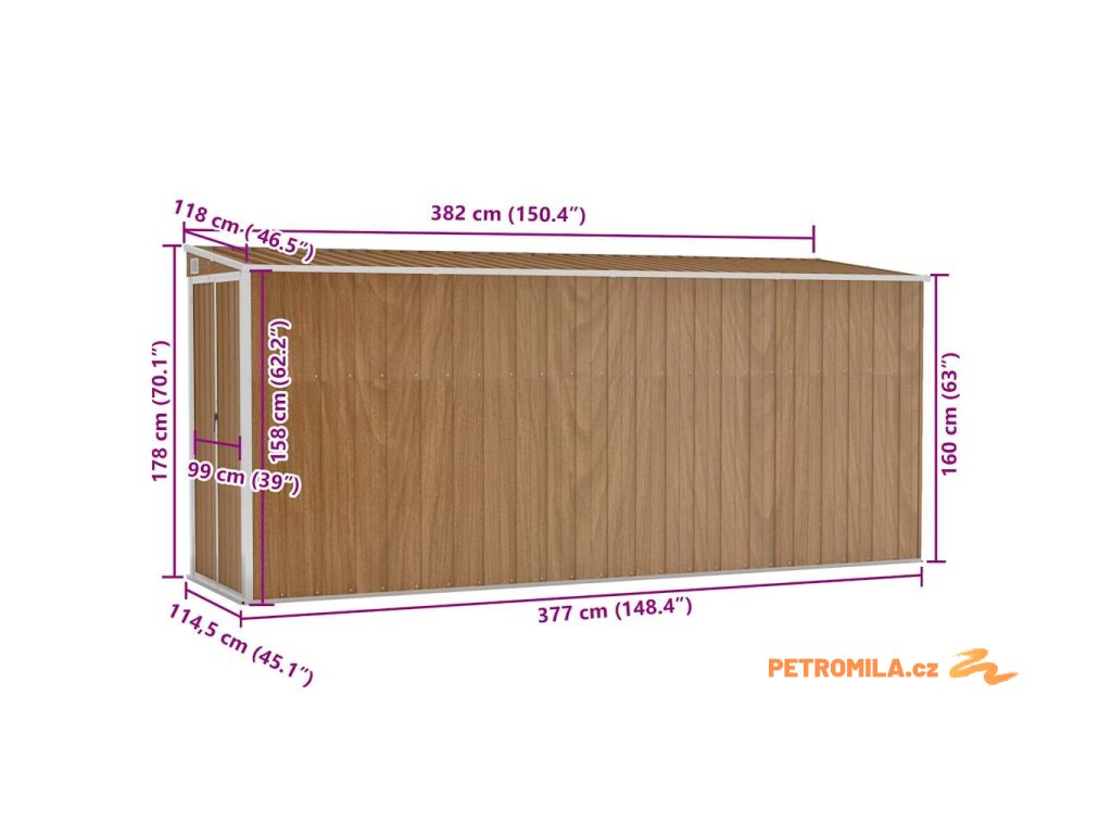 Nástěnný zahradní domek hnědý 118 x 382 x 178 cm pozinkovaná ocel
