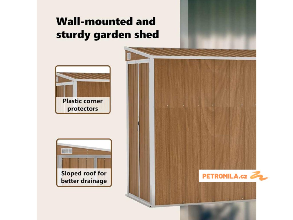 Tento nástěnný zahradní domek je ideální pro uložení různých předmětů, jako je nářadí, zahradní nábytek, zahradní vybavení atd. Domek nabízí ochranu před nečistotami, prachem a také před silným větrem a povětrnostními vlivy.