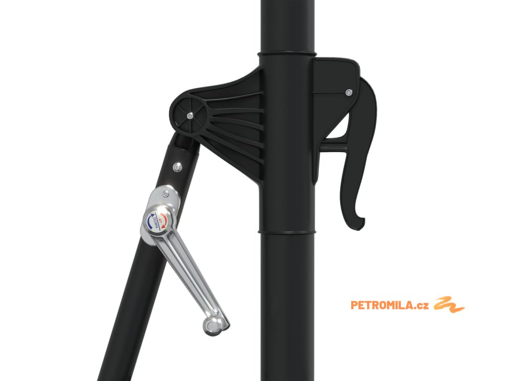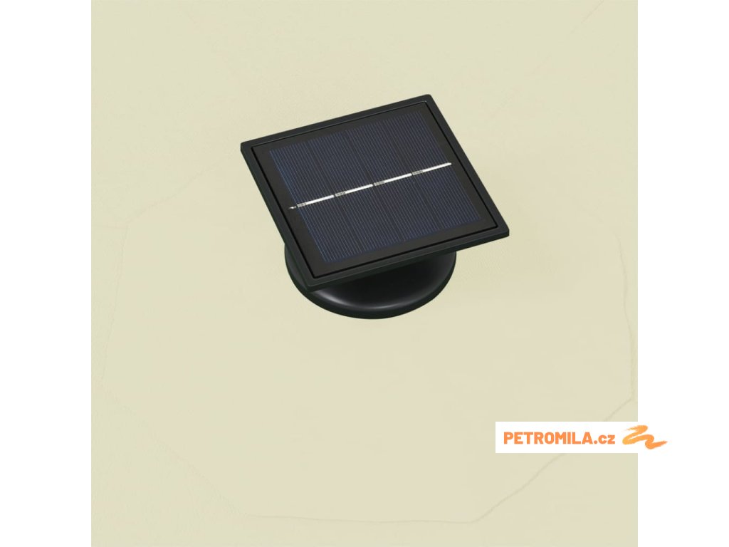 Slunečník je vyrobený z polyesteru, který je odolný vůči UV paprskům a blednutí barev. Poskytne vám tudíž optimální ochranu před sluncem a snadno se čistí. Slunečník má také exkluzivní sklopný design, takže když začne slunce odpoledne klesat k obzoru, můžete ho sklopit a zůstat v příjemném stínu. Stabilitu a odolnost slunečníku zajišťuje silná kovová tyč spolu s 8 odolnými žebry. Zahradní slunečník jednoduše otevřete a zavřete klikovým mechanismem. A chcete-li si večer vytvořit útulné a romantické prostředí, stačí rozsvítit 28 integrovaných LED světel.