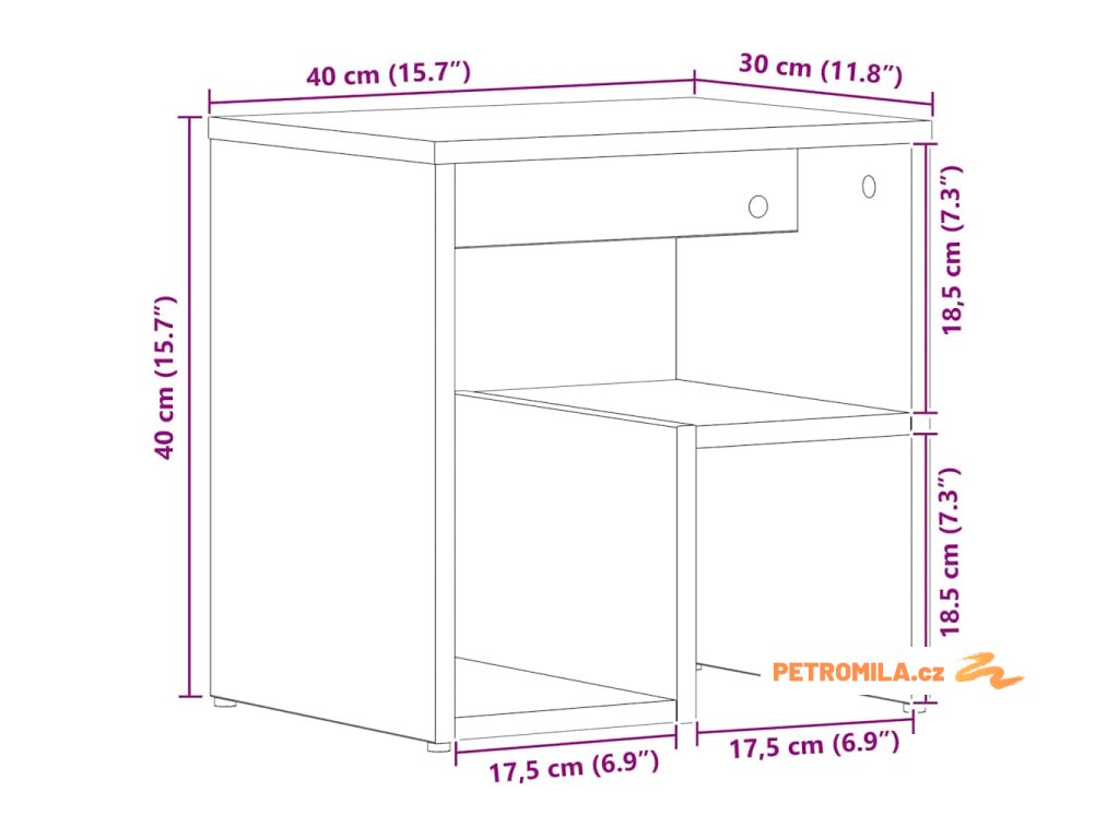 Tenhle stylovej noční stolek vnese moderní atmosféru do vaší ložnice. Vyroben z kompozitního dřeva, jeho minimalistickej design se hodí do všech typů interiérů. Je kompaktní, má rozměry 40 x 30 x 40 cm, což je ideální pro malý prostory. Navržen tak, aby udržel vaše nezbytnosti, jako je lampa nebo osobní věci, takže to máte všechno po ruce, když relaxujete.