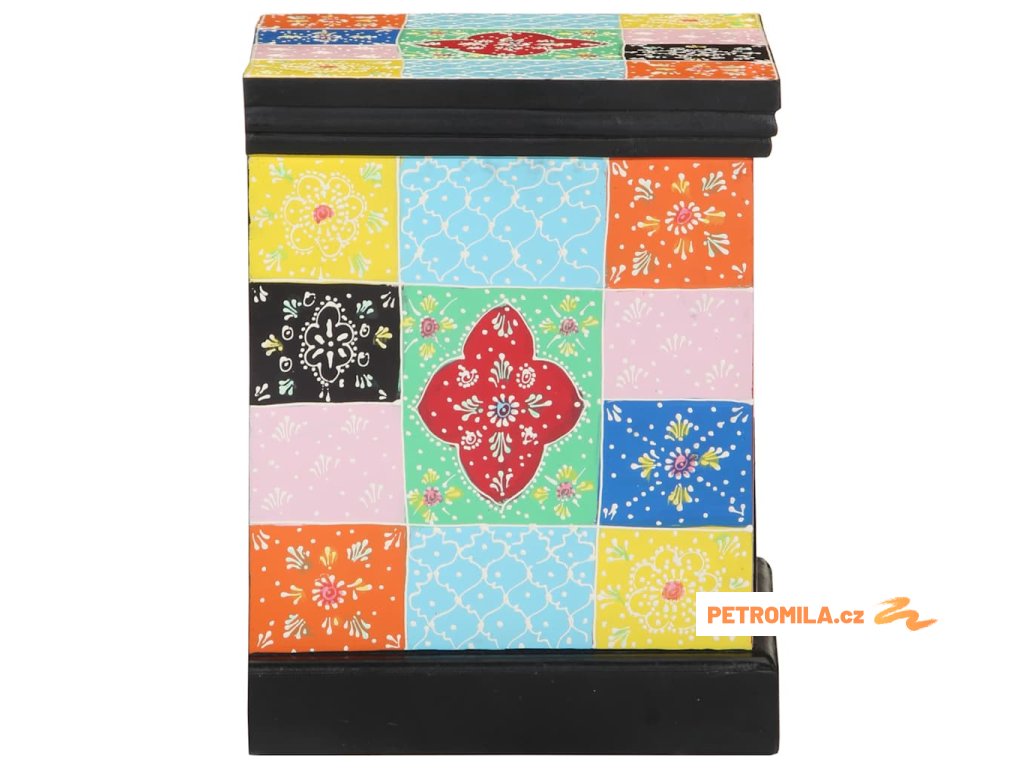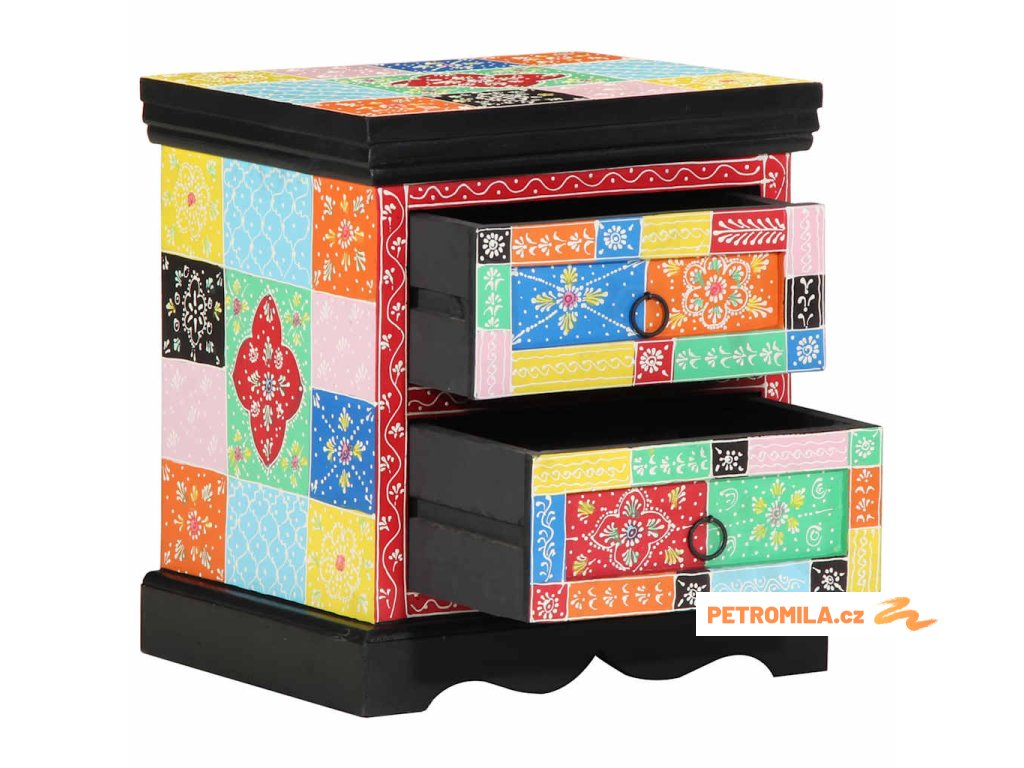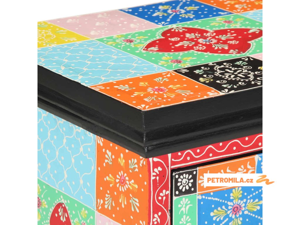 - Součásti: Tradiční zásuvky s funky vícebarevnými povrchy a elegantními černými kovovými kroužkovými úchyty pro snadný přístup. Každá přední část zásuvky má unikátní design, což dodává charakter s krásnými inlayemi.
