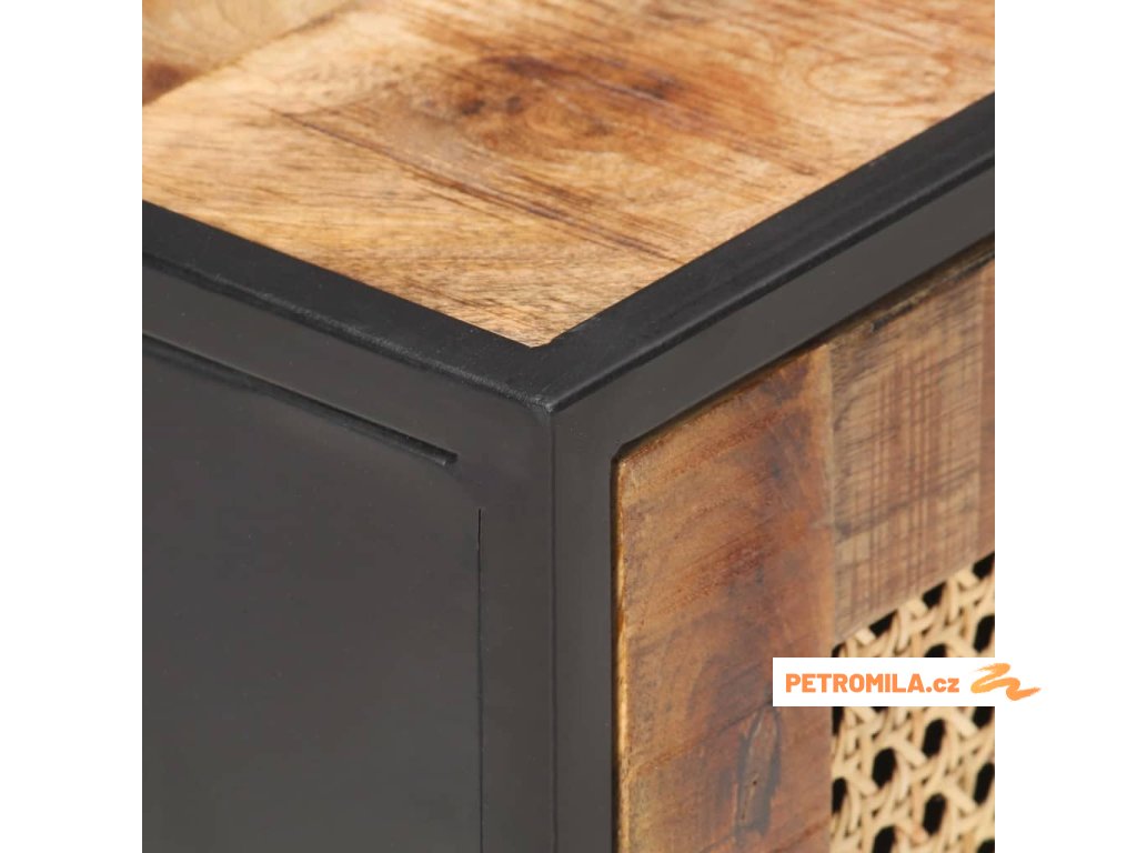 Masivní mangovník je tropické tvrdé dřevo, které jednak unese značnou váhu a jednak výborně odolává zubu času a neopotřebovává se. Precizní řemeslné zpracování a nádherná kresba dřeva dává každé noční skříňce odlišný charakter, takže nenajdete dvě zcela stejné. Noční stolek nabízí spoustu úložného místa, takže si do něj můžete přehledně uložit vše potřebné nebo si na něm vystavit různé dekorace. Železné nohy zajišťují stabilitu a odolnost skříňky. Odkládací skříňka má navíc na dvířkách dekorativní vzor z ručně vyplétaného rákosu, který ji propůjčuje rustikální šarm.