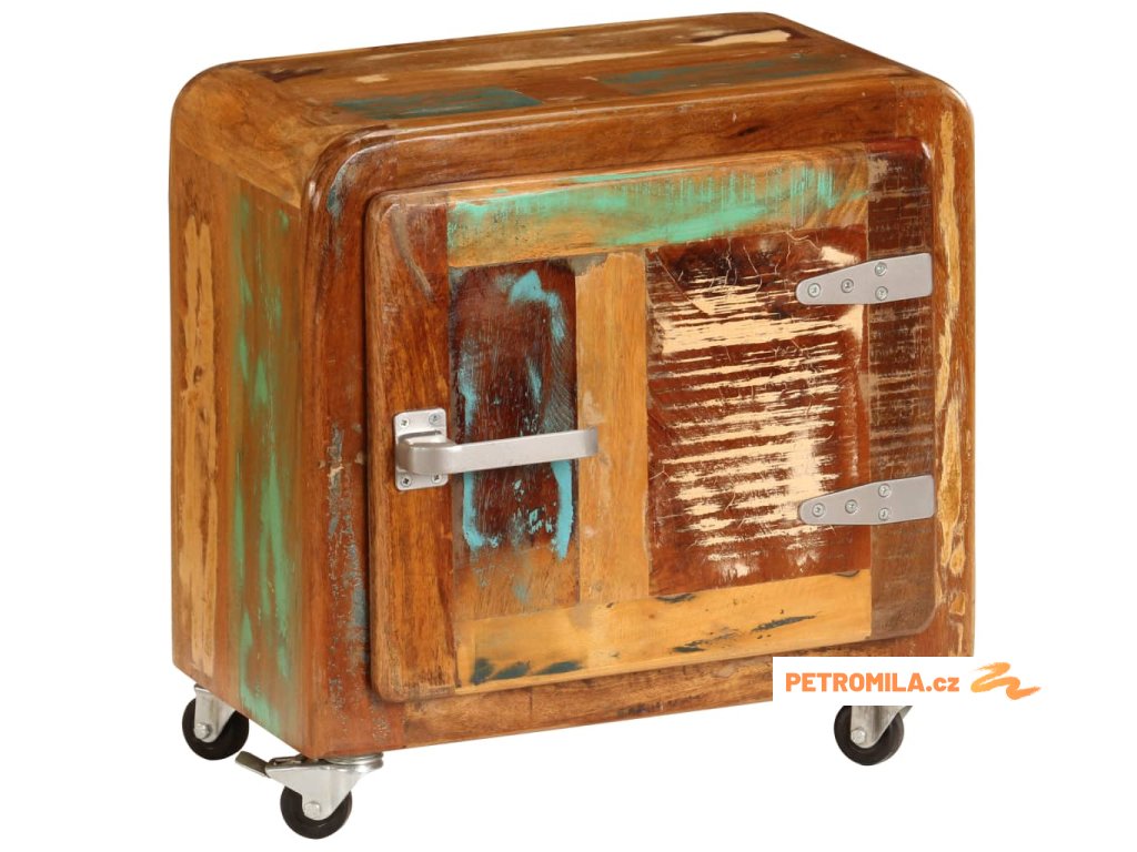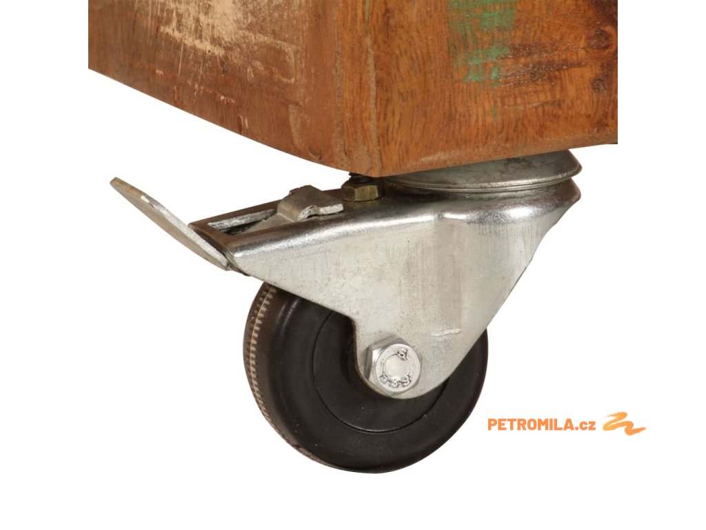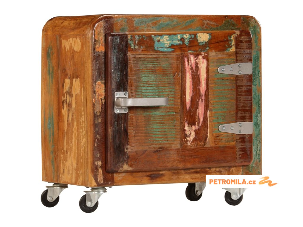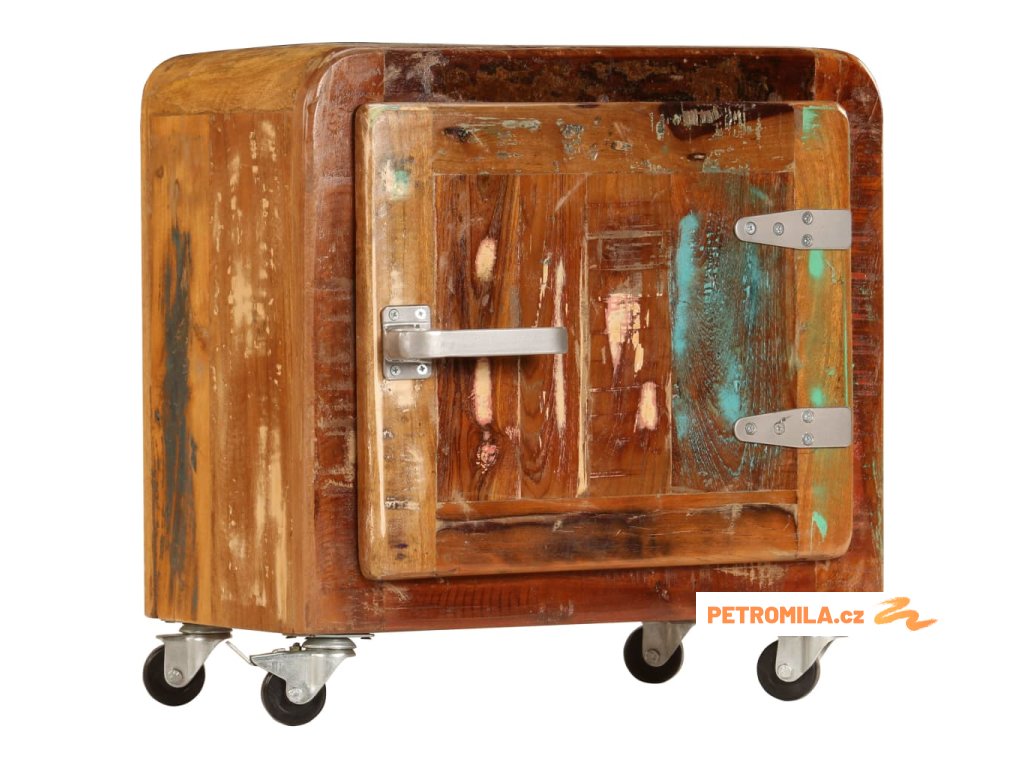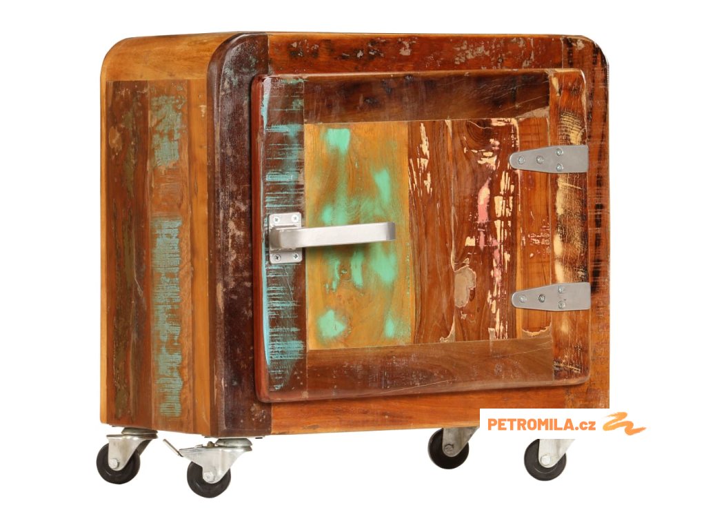 Noční stolek je vyrobený z masivního recyklovaného dřeva, které pochází z trámů, podlah a podpěrných nosníků starých budov určených k demolici. Sestává tedy z různých druhů dřeva, jako jsou borovice, teak, buk, dub, cedr, mangovník, akácie apod. Recyklované dřevo tak nabývá vlastností všech těchto rozličných typů dřevin. Navíc je již zestárlé, ošlehané a vyschlé, takže se nesmršťuje ani neohýbá. Stolek je celý ručně vyrobený a atraktivní kresba dřeva ho činí naprosto jedinečným a lehce odlišným od všech ostatních. Kovové prvky dodávají stolku industriální nádech. Skříňka vám také poskytne spoustu místa, kam si můžete schovávat knížky, zápisníčky, psací potřeby a další drobnosti. Jelikož je vybavena 4 kolečky, můžete celý stolek bez námahy přesouvat.
