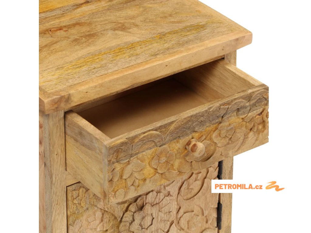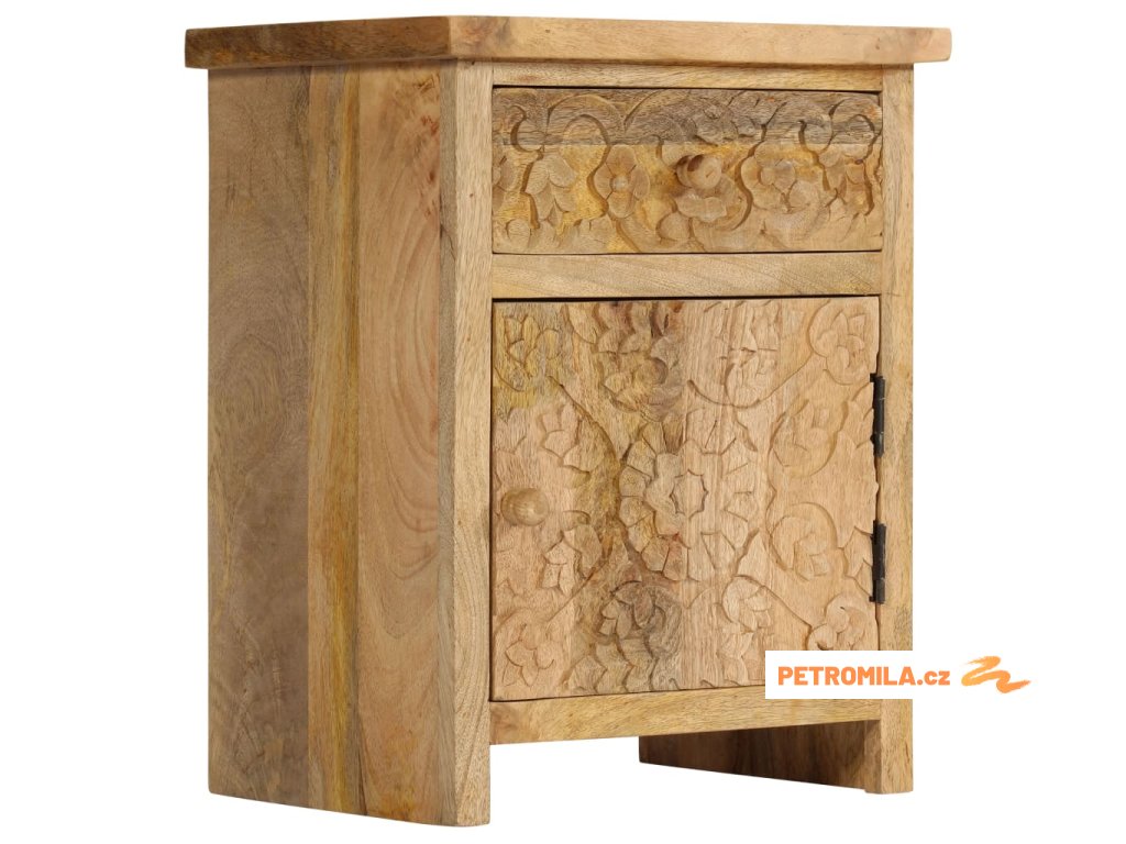 Odkládací stolek je vyroben z masivního mangovníkového dřeva a je vysoce stabilní a odolný. Pevná horní deska je ideální k odložení vašich sklenic, knih, šálků na čaj atd. Noční stolek poskytuje dostatek úložného prostoru pro úhledné uspořádání různých předmětů. Vyřezávané detaily dodávají nočnímu stolku nádech elegantního šarmu. Tento výrobek je dodávaný ve složeném stavu, montáž není nutná.