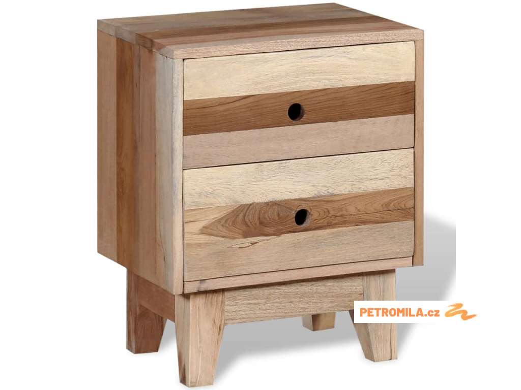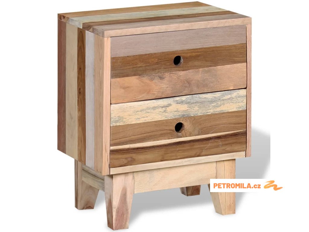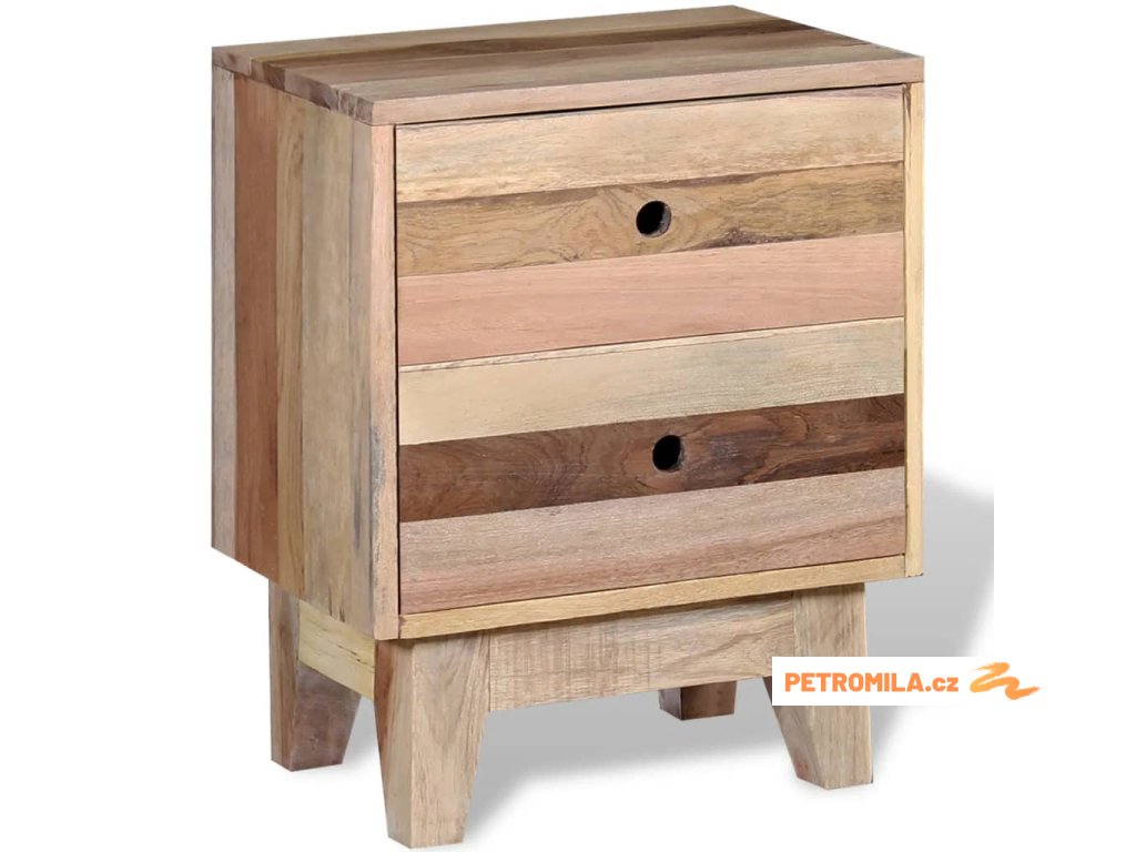 Tento noční stolek se 2 zásuvkami je vyroben z masivního recyklovaného dřeva a vyzařuje vintage šarm, takže bude stylovým doplňkem do vašeho interiéru. Odlišnosti ve struktuře a barvě dřeva dávají tomuto kusu nábytku jedinečný charakter.