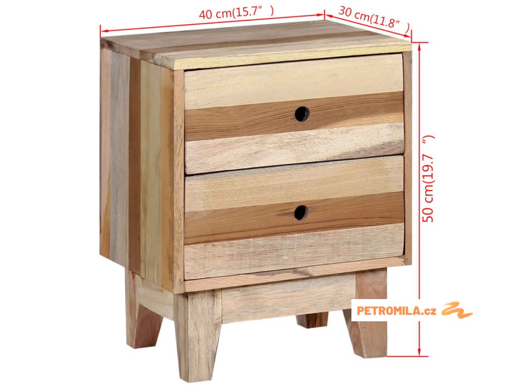 Noční stolek je vyrobený z recyklovaného dřeva, což znamená, že každý kus je jedinečný a lehce se odlišuje od ostatních. Nábytek vyrobený z použitého dřeva má vlastnosti různých druhů dřeva, jako je teak, akácie, mangovník, damarovník atd. Recyklované dřevo je masivní, solidní, odolné a krásné. Známky opotřebení a odhalená struktura dřeva dodávají každému kusu jeho vlastní historii a jedinečný vzhled.