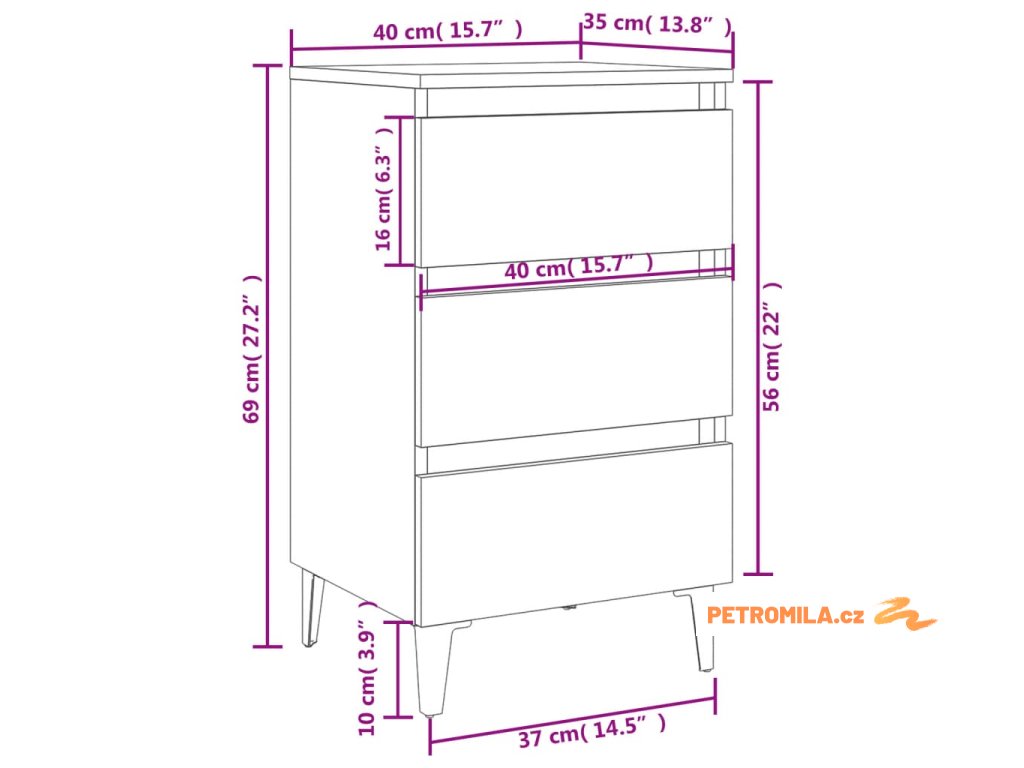 Tento noční stolek se čtyřmi kovovými nohami je velmi stabilní a bytelný. Je navíc vybavený třemi zásuvkami, které nabízejí dostatek úložného prostoru pro přehledné uspořádání vašich věcí, které budete mít po ruce. Snadno se také čistí vlhkým hadříkem.