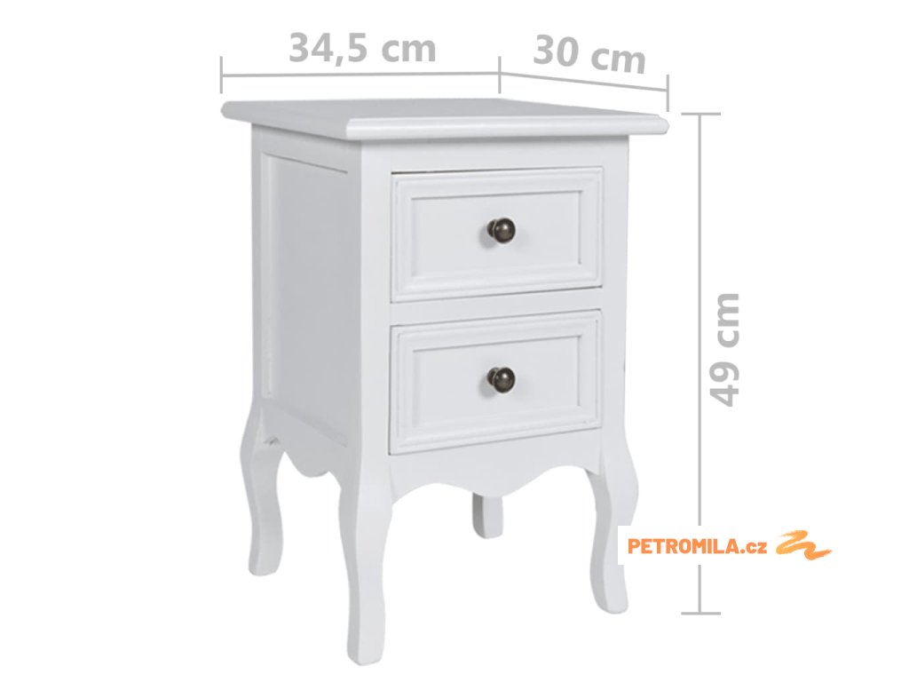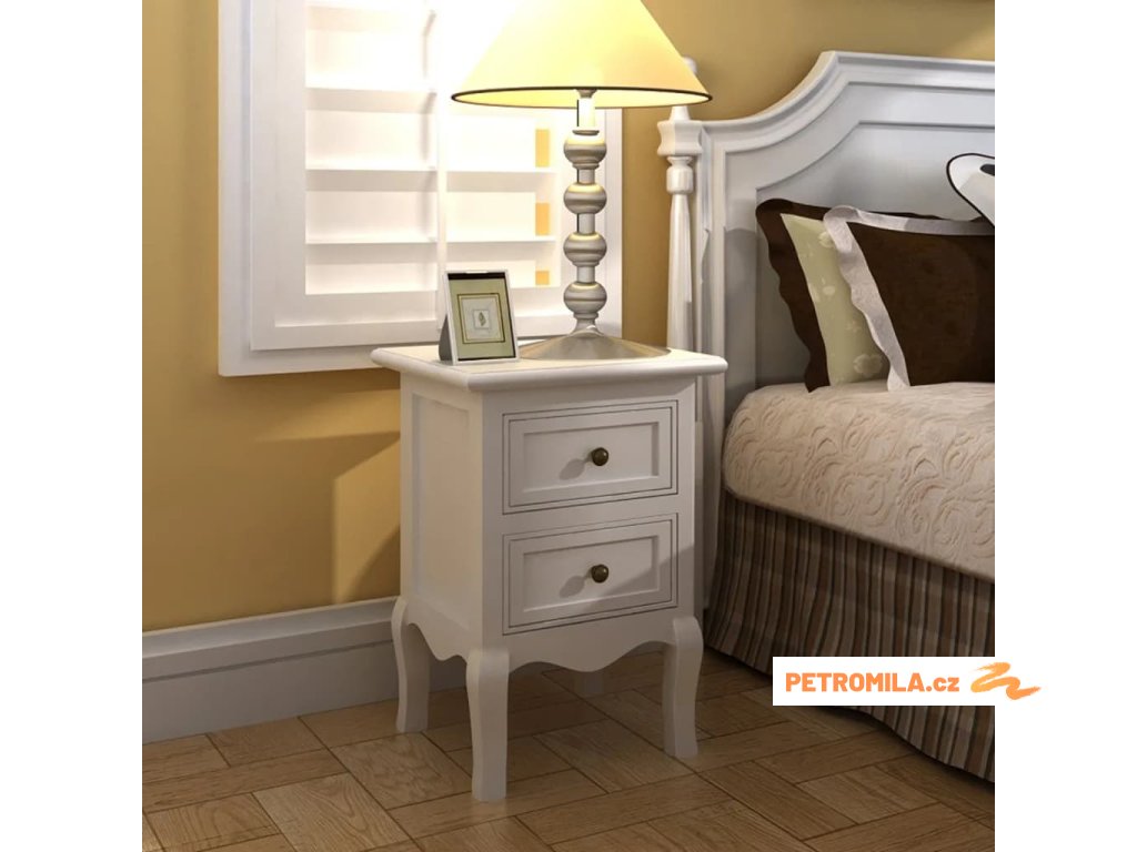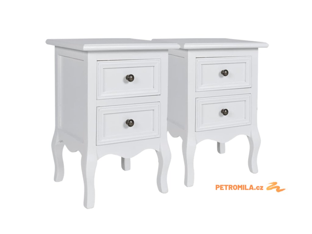 Každý noční stolek má dvě zásuvky, jejichž čelo je vyrobené z pravého jasně lakovaného dřeva. Zásuvky jsou tudíž nejen praktické, ale také spolu se zaoblenými nohami a niklovými úchytkami podtrhují elegantní styl těchto nočních stolků. Skříňky nočních stolků jsou vyrobeny z odolného bílého MDF materiálu.