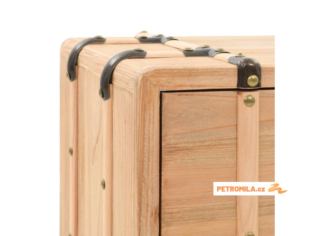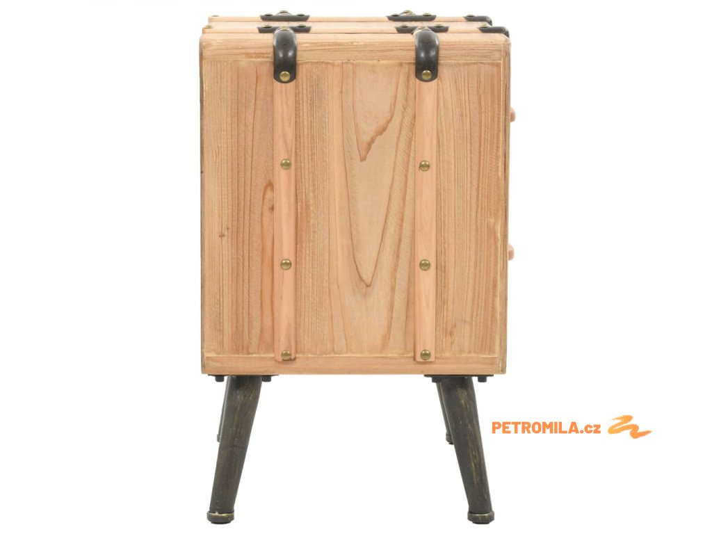 Stabilní a odolný noční stolek je zhotoven z masivního jedlového dřeva. Má robustní stolní desku a dvě zásuvky, jež vám poskytnou spoustu prostoru pro přehledné uspořádání nejrůznějších předmětů, které chcete mít po ruce, jako jsou knihy, brýle, dálkové ovladače apod. Jedinečný design v podobě zavazadla umocňuje celkový vintage styl stolku. Montáž je snadná.