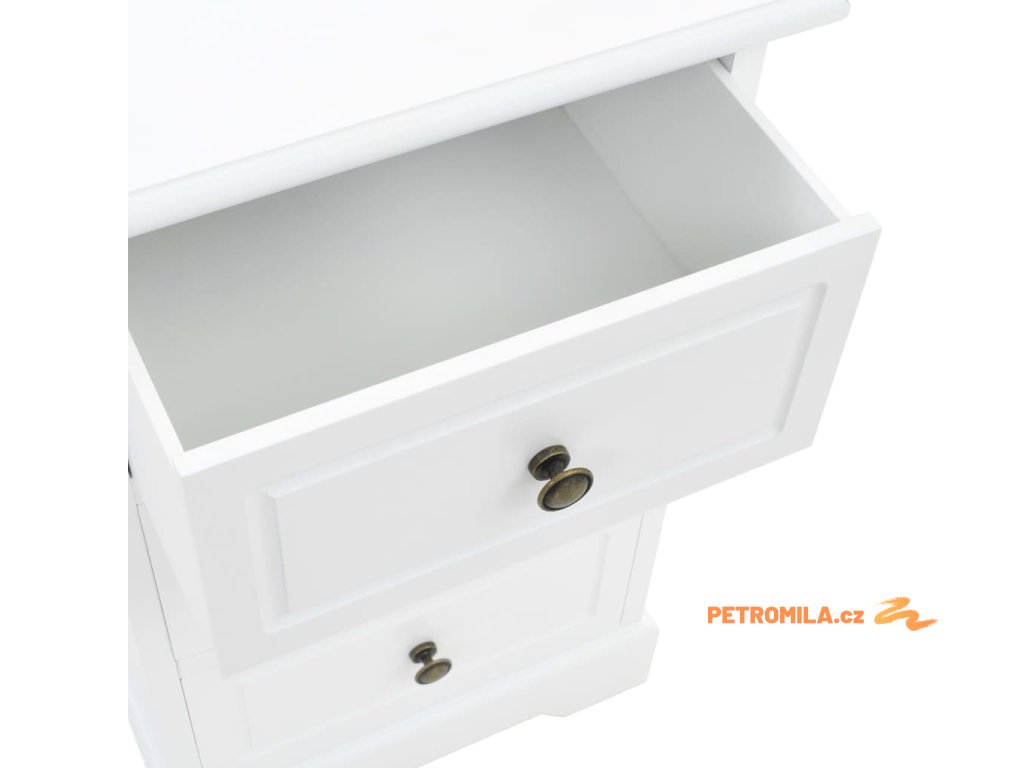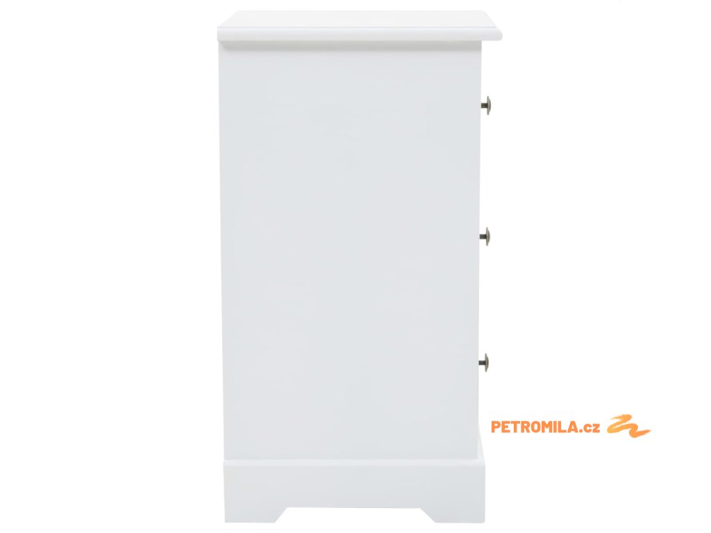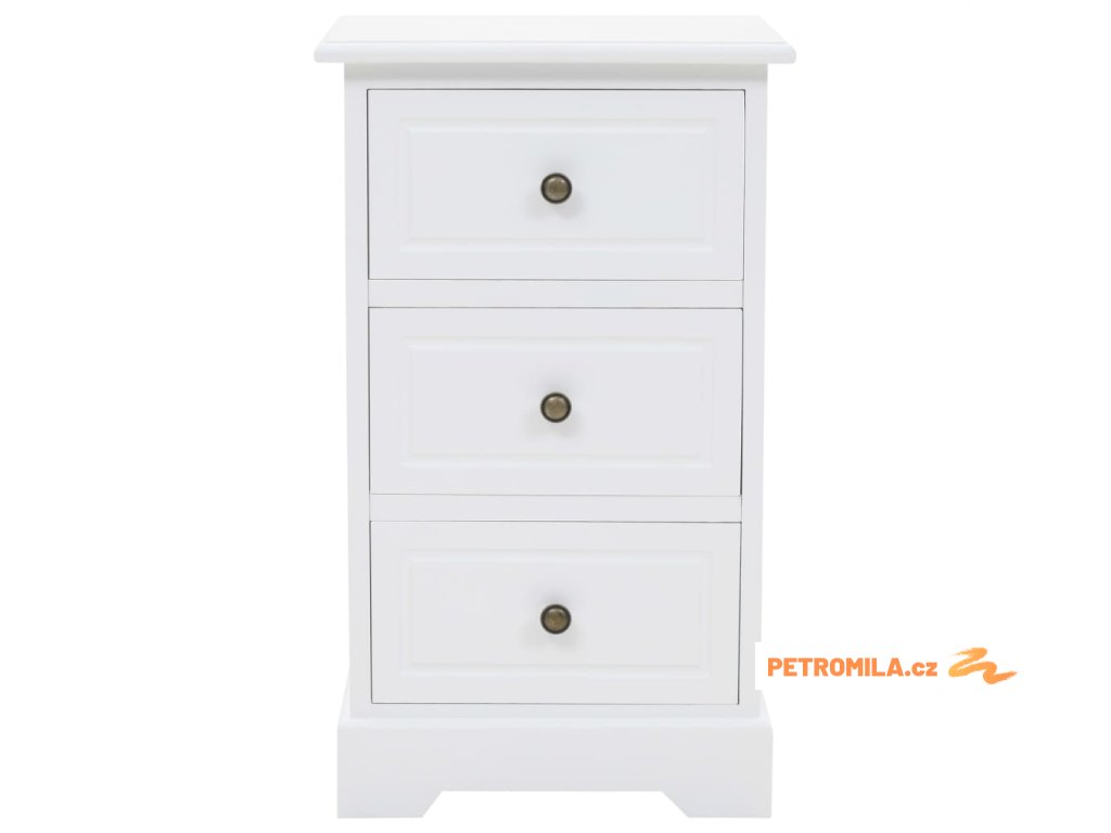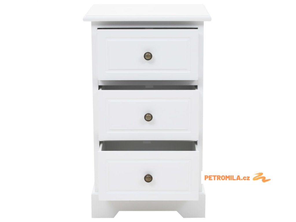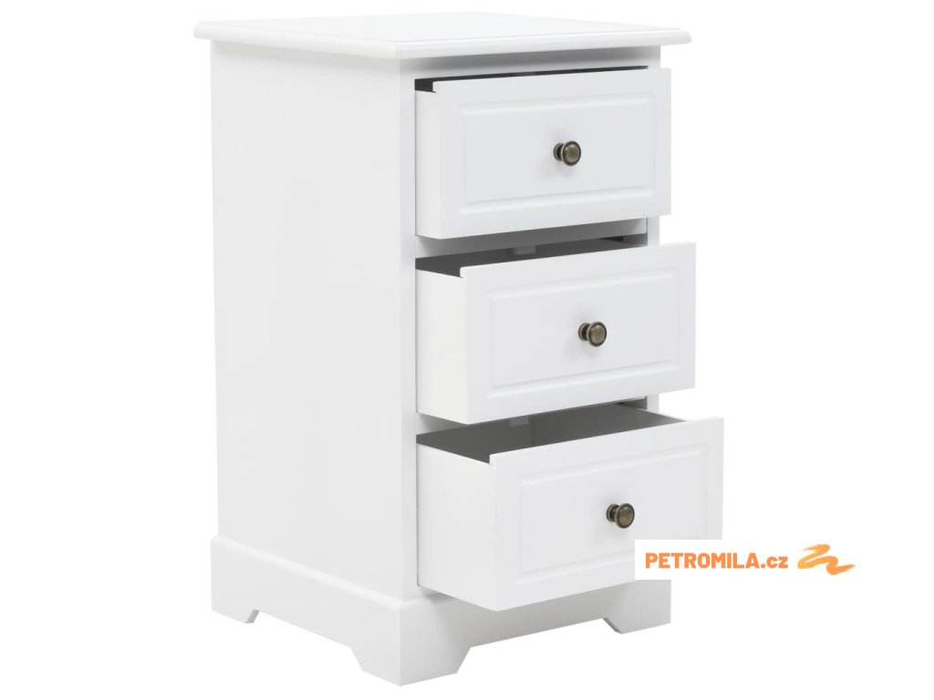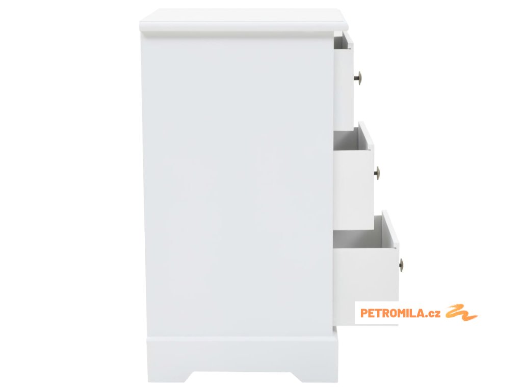 Noční stolek je vyroben z MDF a jeho zásuvky jsou ozdobeny kovovými úchytkami. Disponuje 3 zásuvkami, které vám nabídnou spoustu úložného prostoru, kde můžete přehledně uchovávat menší předměty tak, abyste je měli stále po ruce. Na horní desku skříňky můžete navíc postavit svůj budík, osvěžující sklenici vody anebo dekorativní předměty, jako jsou zarámované fotografie.