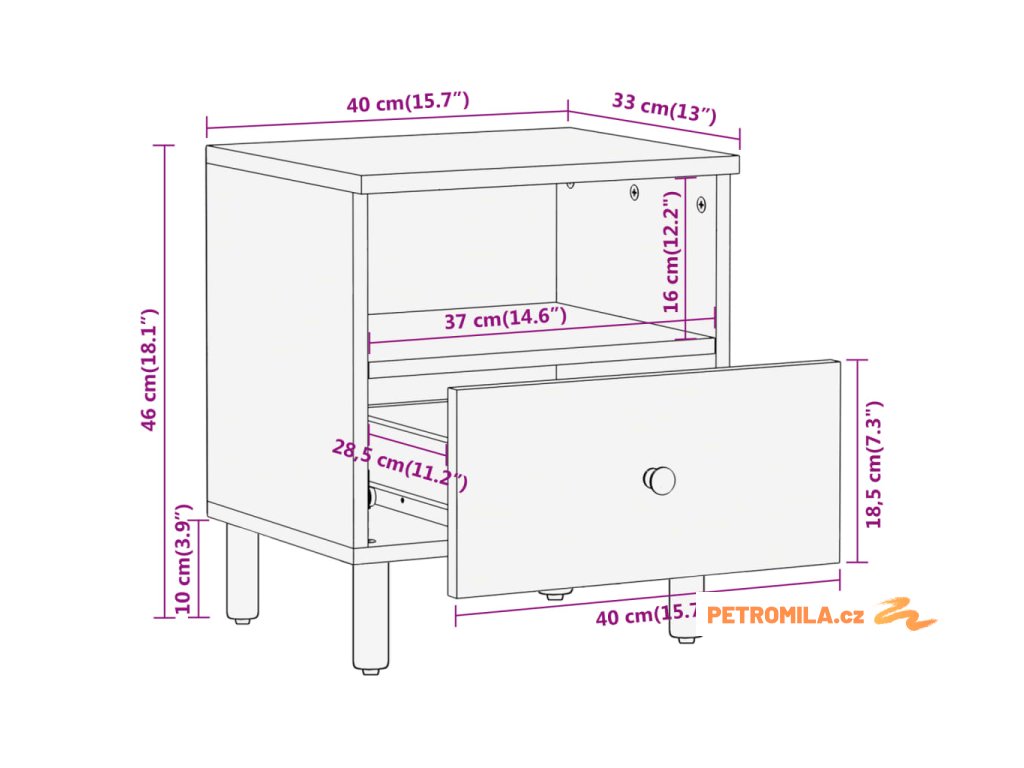 - Dostatek úložného prostoru: Noční stolek je navržen s 1 zásuvkou a 1 přihrádkou, kde budete mít vaše věci uspořádané a neustále po ruce.