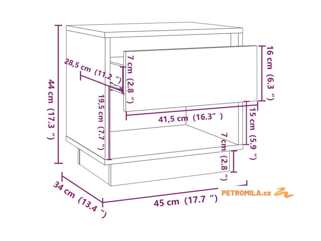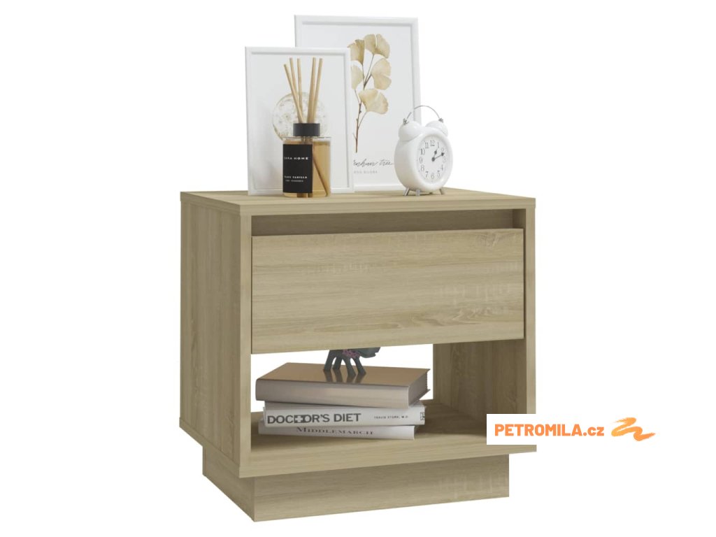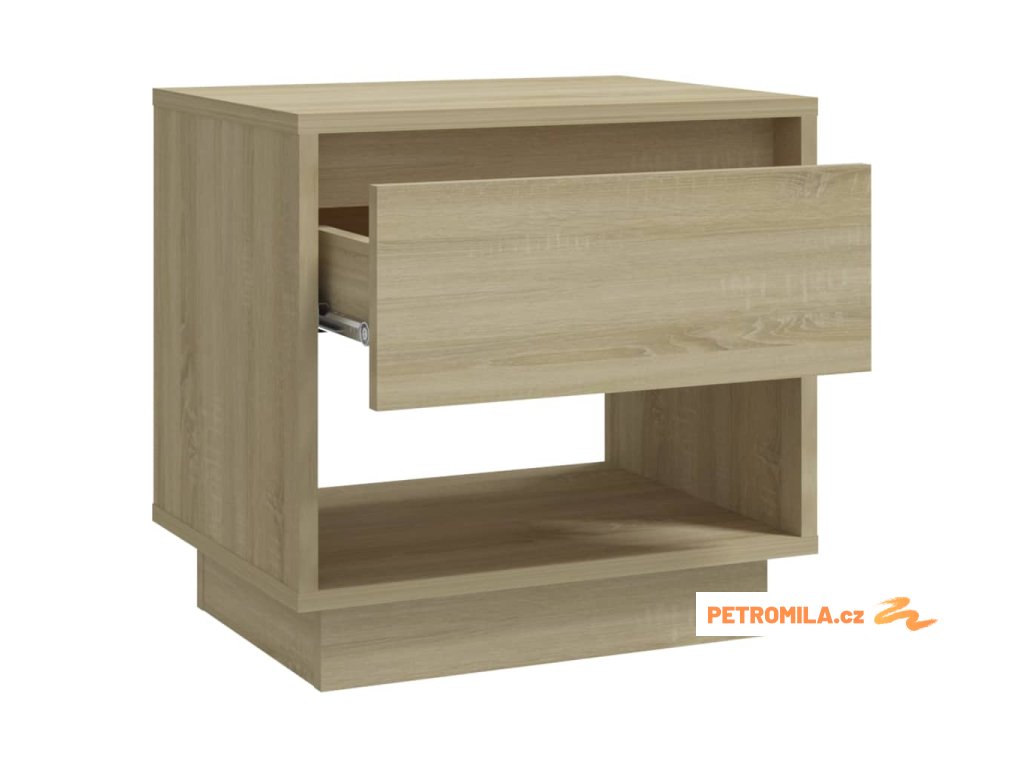 Noční stolek se vyznačuje pevnou a odolnou konstrukcí, která zajišťuje jeho dlouhou životnost. Zásuvka a otevřená přihrádka poskytují dostatek úložného prostoru a své drobnosti budete mít dobře uspořádané a po ruce. Pevná horní deska je ideální pro umístění lampičky, budíku atd.
