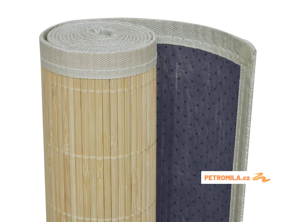 Spodní strana bambusového koberce je podložená neklouzavou vrstvou z PVC, která poskytuje nejen vynikající tlumení, ale navíc udržuje koberec na místě. Polypropylenové okraje dodávají bambusové rohoži pečlivě dokončený vzhled. Koberec je vyrobený z přírodního pevného bambusu a snadno se čistí.