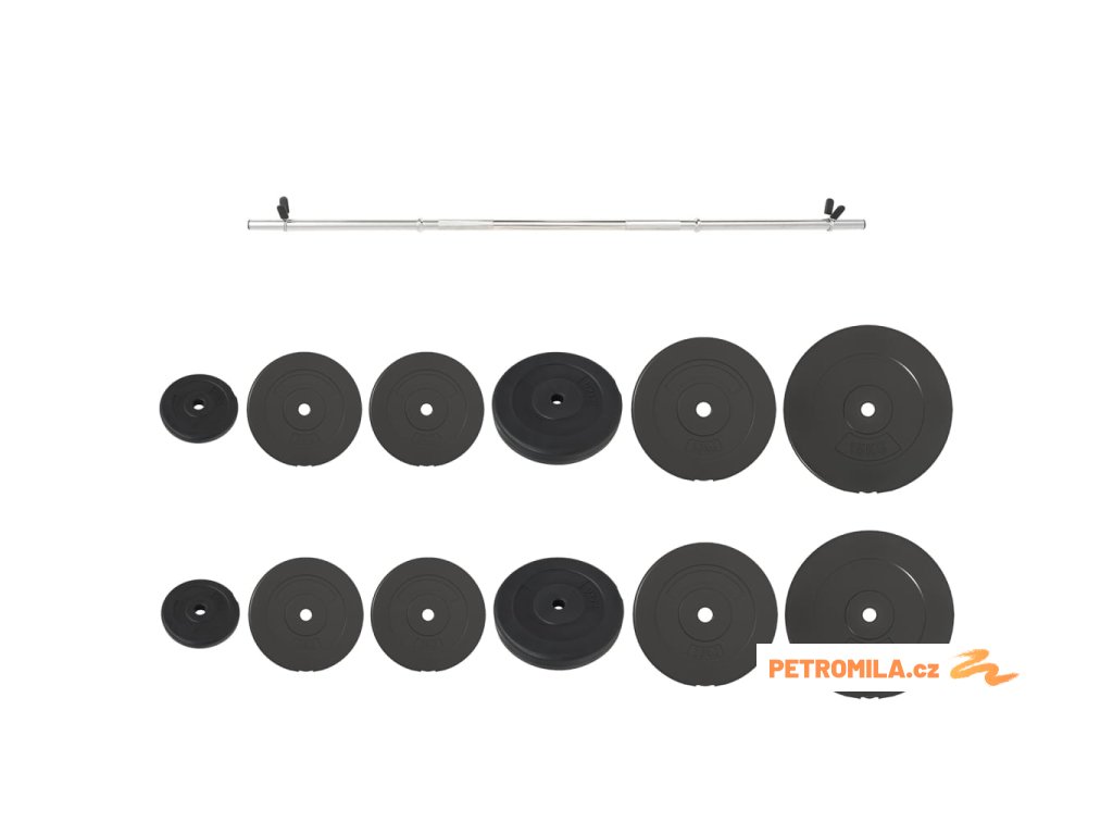 - Hmotnost kotoučů: 4x 5 kg, 2x 7,5 kg, 2x 1,25 kg, 2x 15 kg, 2x 10 kg