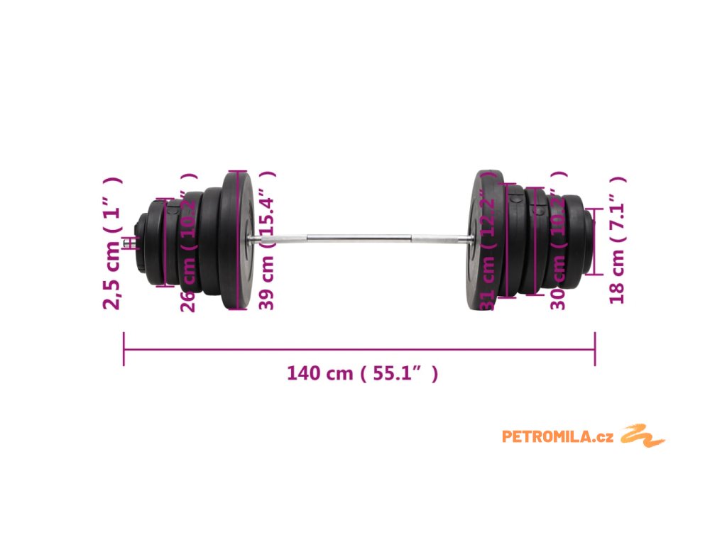 - Rozměry činkové tyče: 25 mm x 140 cm (průměr x D)