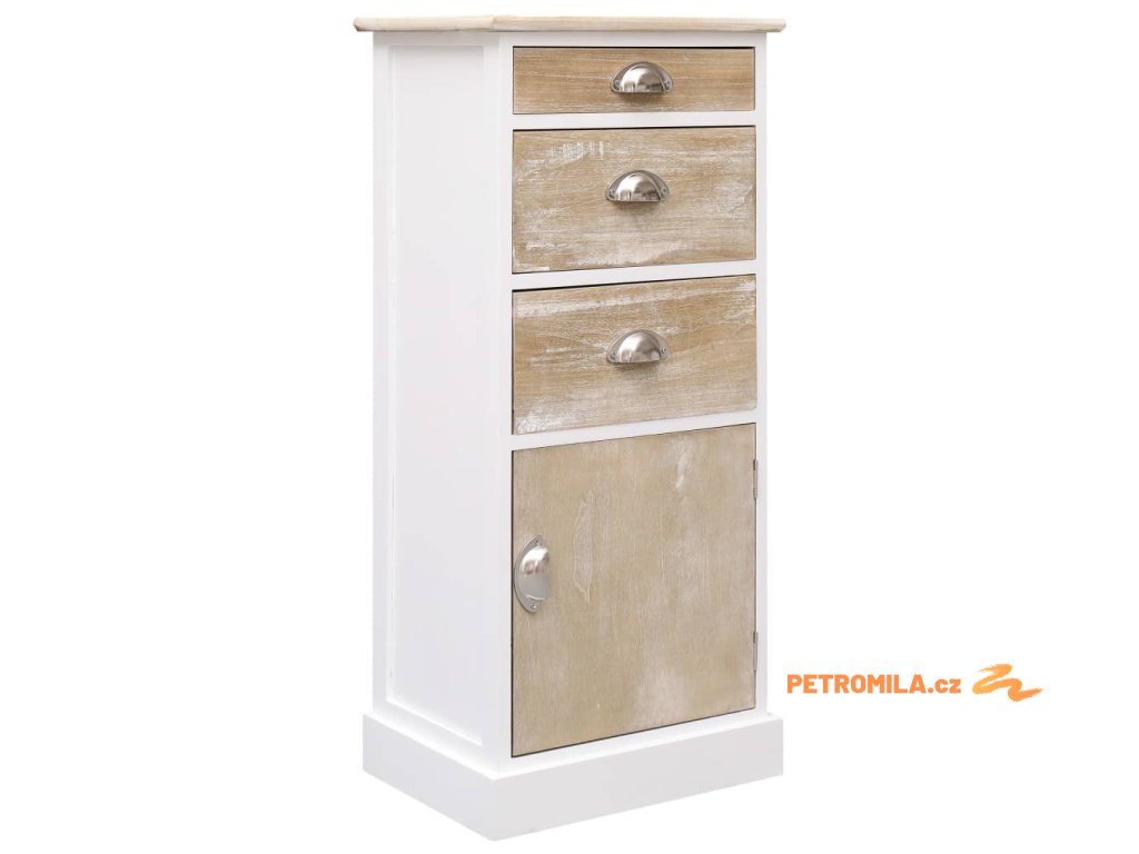 Tato skříňka se zásuvkami je vyrobená ze dřeva pavlovnie a je mimořádně odolná a robustní. Příborník nabízí velký úložný prostor se 3 zásuvkami a 1 dvířky. Robustní horní deska je ideální pro vystavení dekorativních předmětů, fotorámečků nebo pokojových rostlin. Snadno se čistí vlhkým hadříkem. Odkládací skříňka se snadno sestavuje.