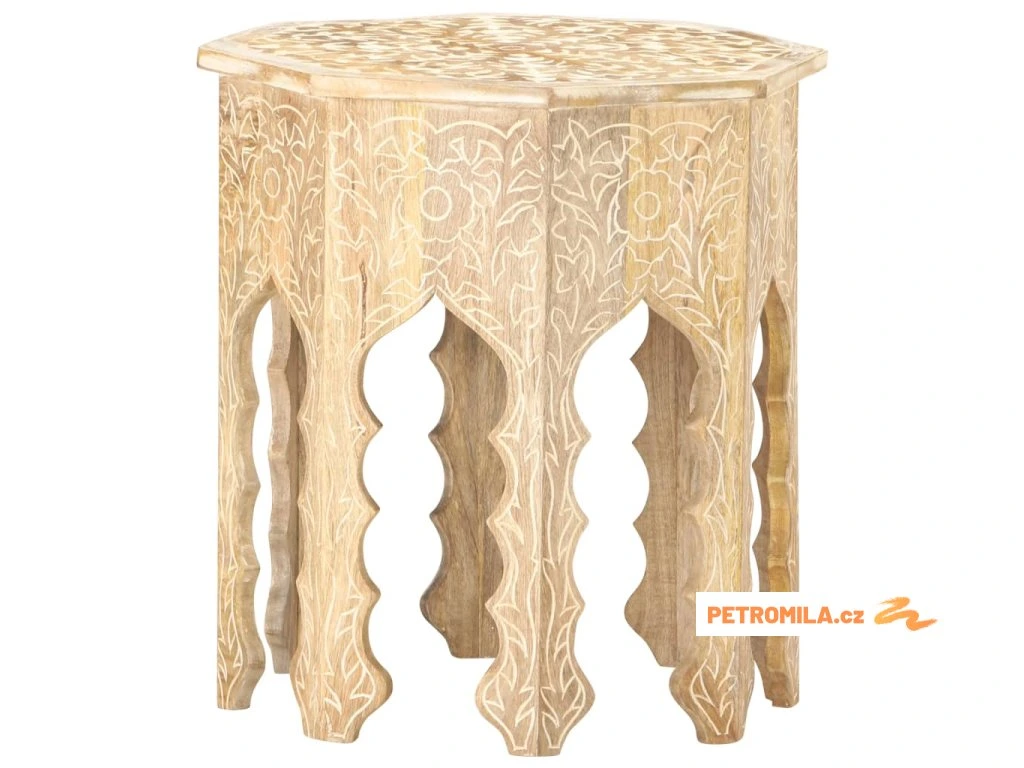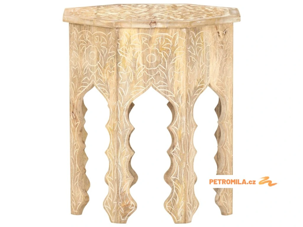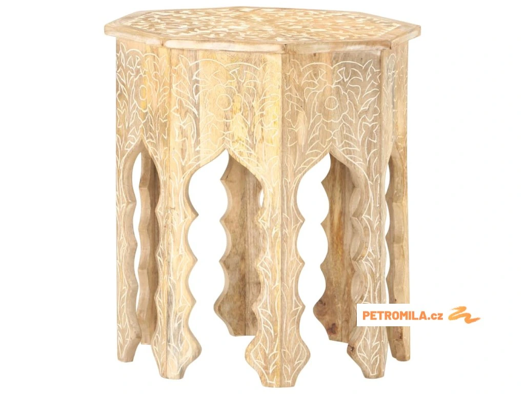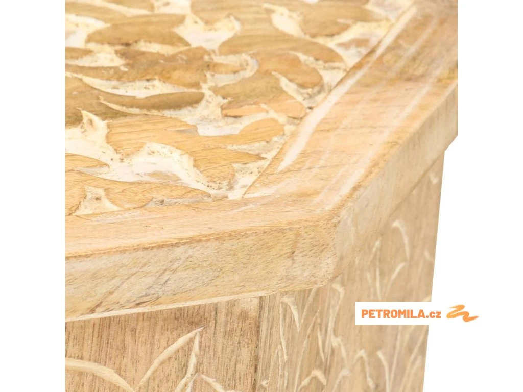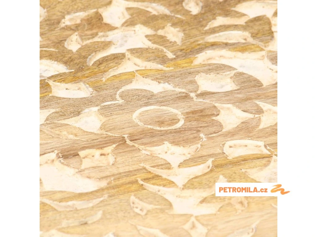 Masivní mangovník je tropické tvrdé dřevo. Toto dřevo jednak unese značnou váhu a jednak výborně odolává zubu času. Precizní řemeslné zpracování a nádherná kresba dřeva navíc jednotlivé stolky k pohovce vzájemně odlišují, takže nenajdete dva stejné. Masivní stolní deska je bezpečná odkládací plocha pro celou řadu věcí. Co víc, ručně vyřezávaný vzor zdůrazňuje krásu tohoto dřevěného nábytku.