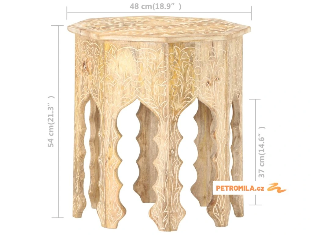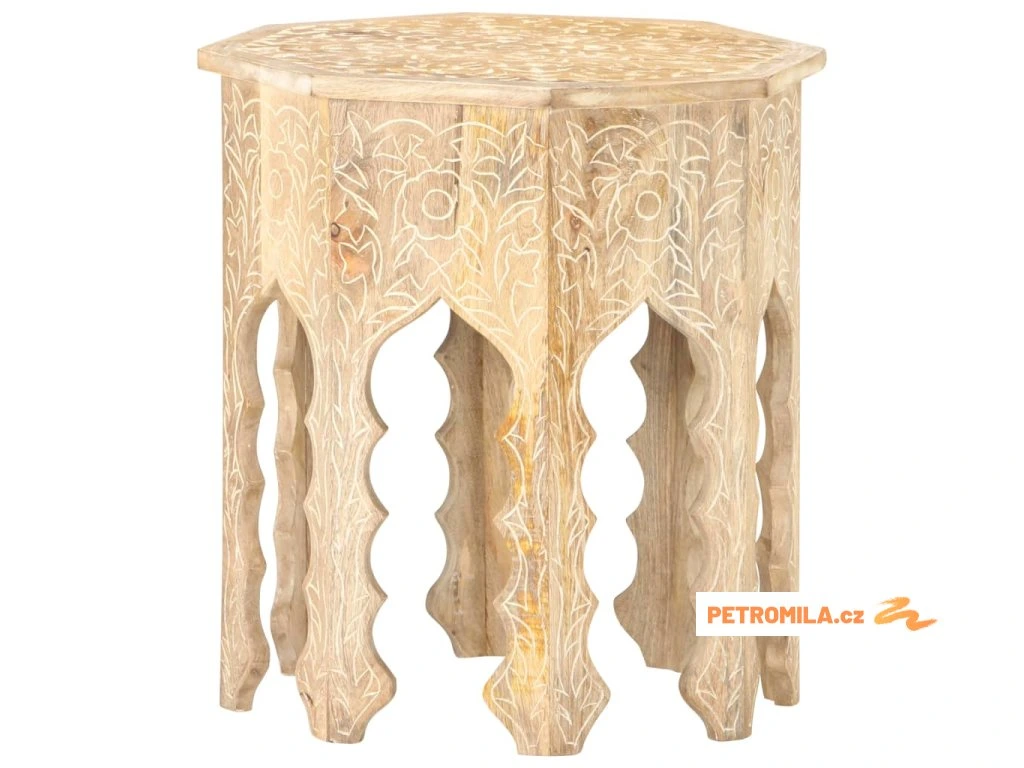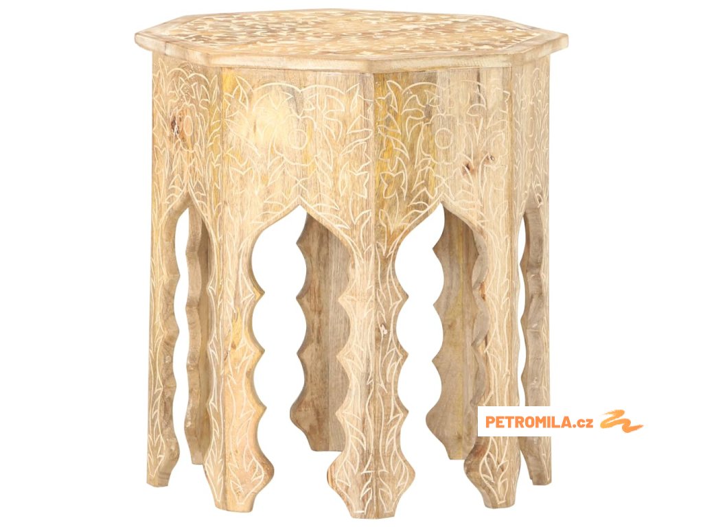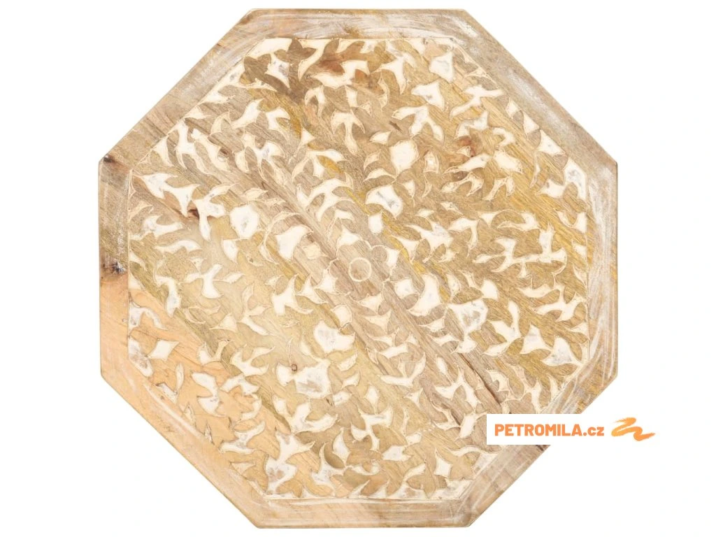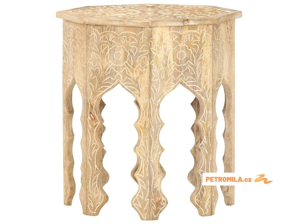 Masivní mangovník je tropické tvrdé dřevo. Toto dřevo jednak unese značnou váhu a jednak výborně odolává zubu času. Precizní řemeslné zpracování a nádherná kresba dřeva navíc jednotlivé stolky k pohovce vzájemně odlišují, takže nenajdete dva stejné. Masivní stolní deska je bezpečná odkládací plocha pro celou řadu věcí. Co víc, ručně vyřezávaný vzor zdůrazňuje krásu tohoto dřevěného nábytku.