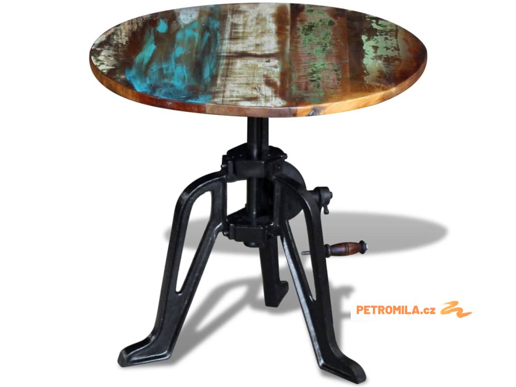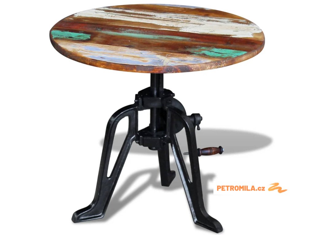 Tento retro dřevěný stolek z recyklovaného dřeva v industriálním stylu má nastavitelnou výšku mezi 42 a 63 cm a můžete ho používat také jako konferenční stolek, stolek ke gauči, do obývacího pokoje, na chodbu apod. Bude to stylový doplněk do vašeho interiéru. Nábytek má velmi pevnou a robustní litinovou základnu.