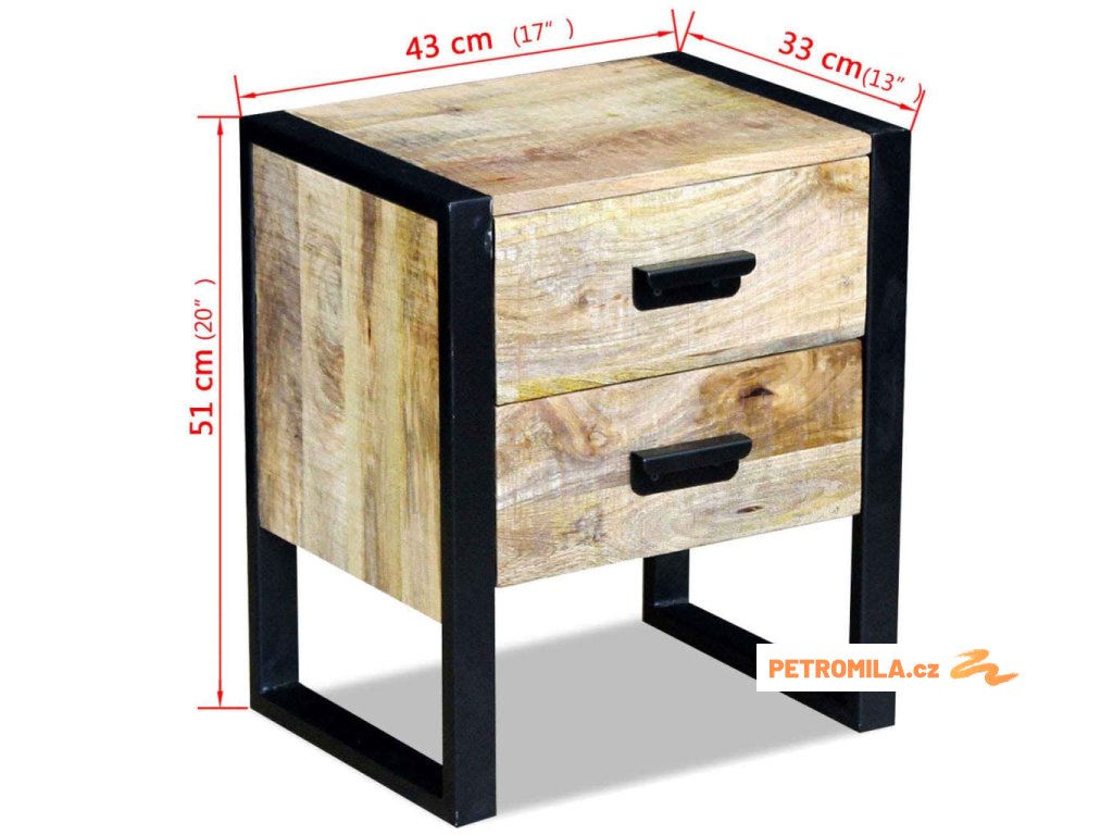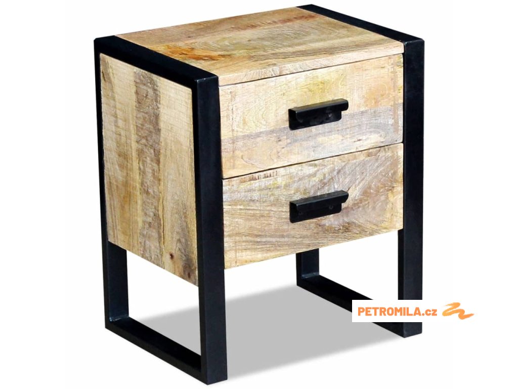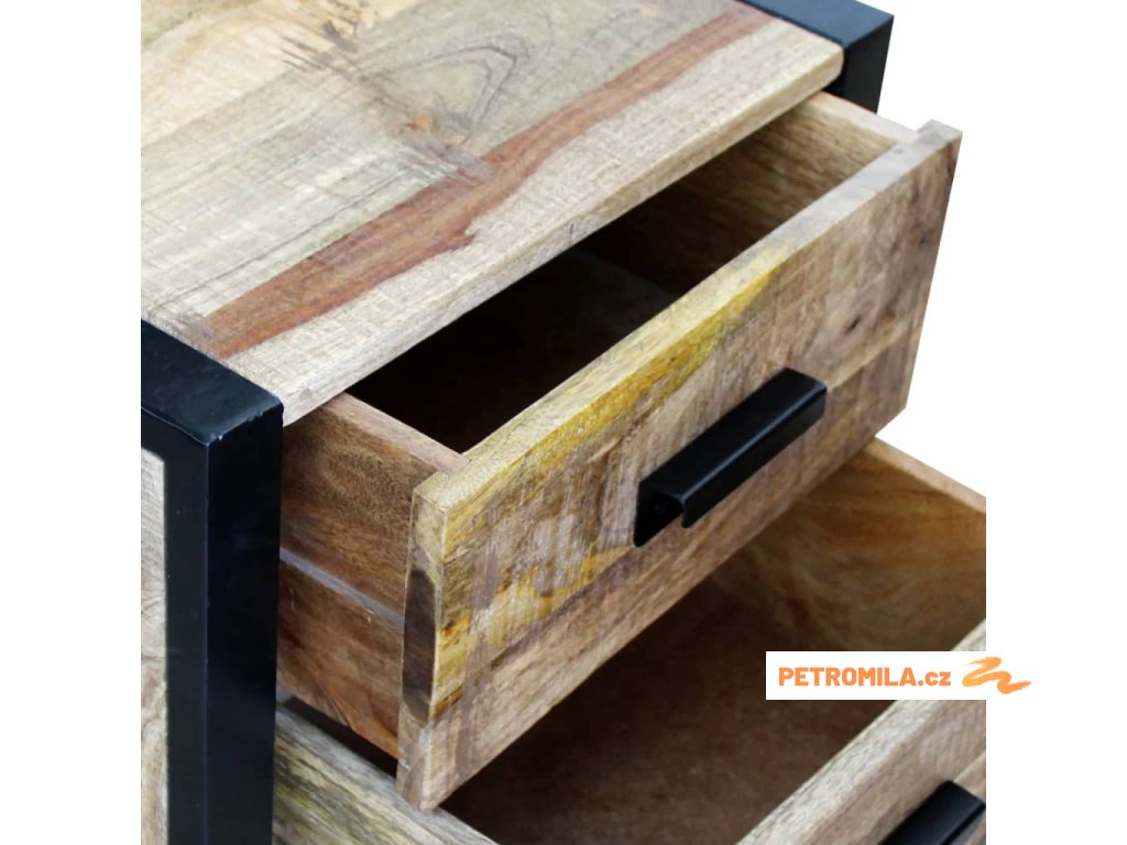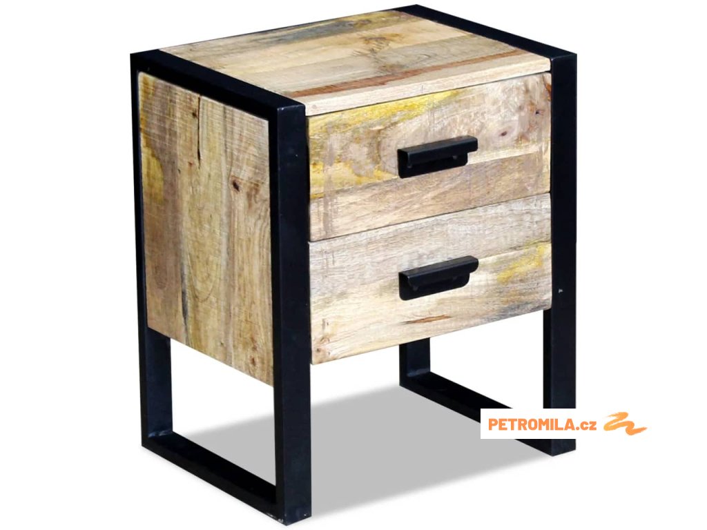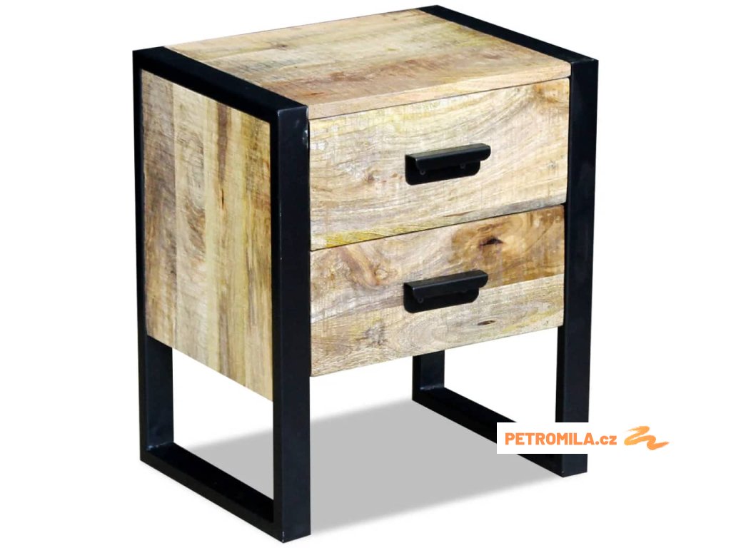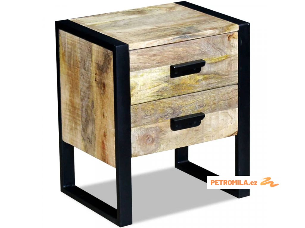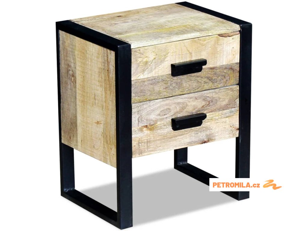 Tento stolek je vyroben z masivního mangovníkového dřeva, takže je bytelný, stabilní a odolný. Jeho dvě zásuvky poskytují dostatek úložného prostoru a krychlové železné nohy mu dodávají jak industriální vzhled, tak stabilitu. Díky viditelné struktuře dřeva je každý kus nábytku jedinečný a lehce se odlišuje od všech ostatních.