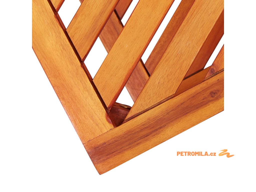 Stolek je vyroben z masivního akáciového dřeva a je odolný vůči povětrnostním vlivům a velmi bytelný. Pevná horní deska i spodní polička vám poskytnou spoustu místa pro nápoje, knihy, časopisy nebo dekorativní předměty. Diagonální vzorování horní desky a poličky dodává stolku klasický vzhled. Montáž je snadná.
