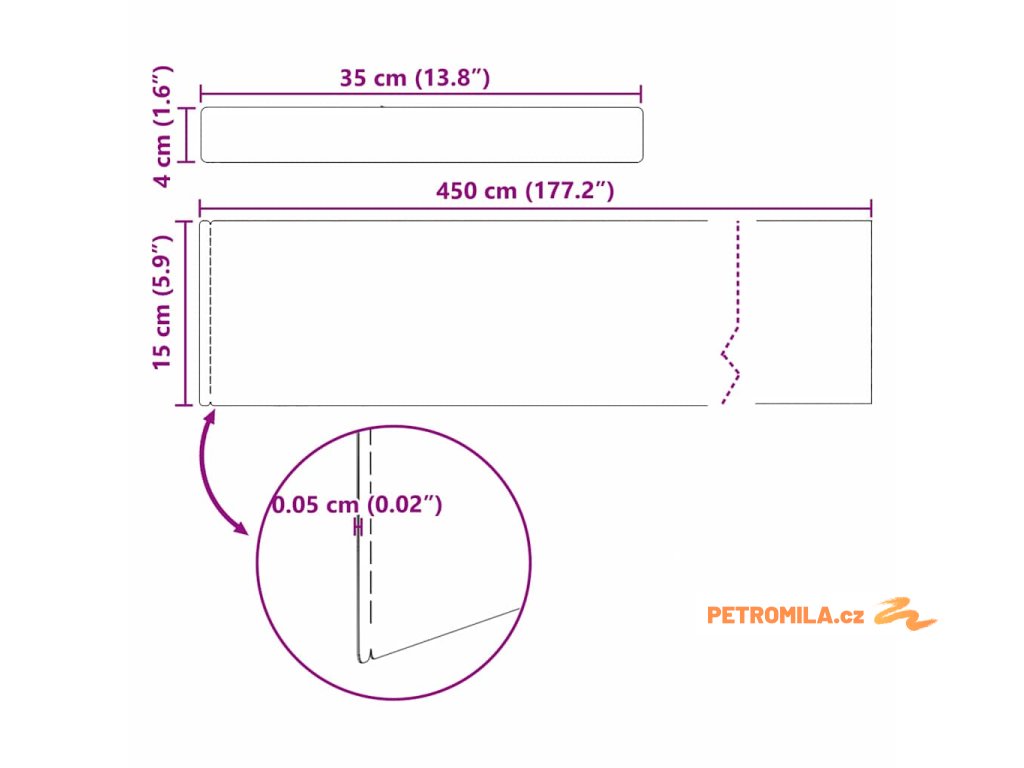 - Celkové rozměry: 450 x 0,05 x 15 cm (D x Š x V)