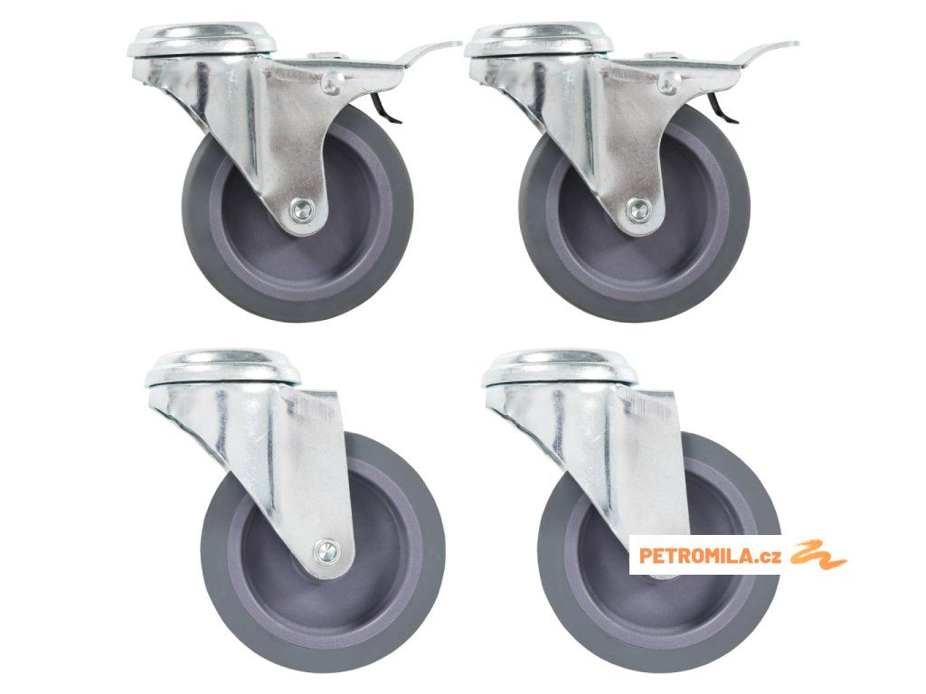 Balení obsahuje 2 otočná kolečka s otvorem pro šroub a 2 otočná kolečka s otvorem pro šroub a dvojitou brzdou.