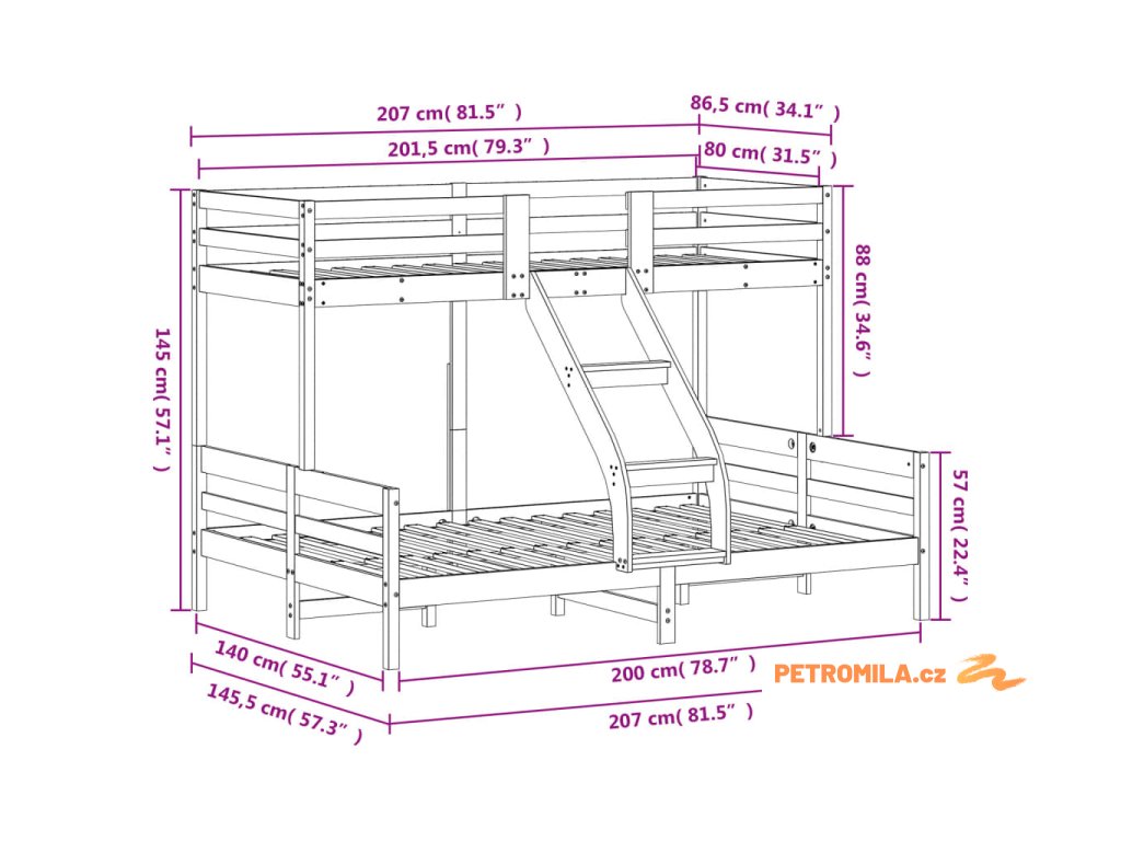 Patrová postel 80 x 200/140 x 200 cm voskově hnědá borové dřevo