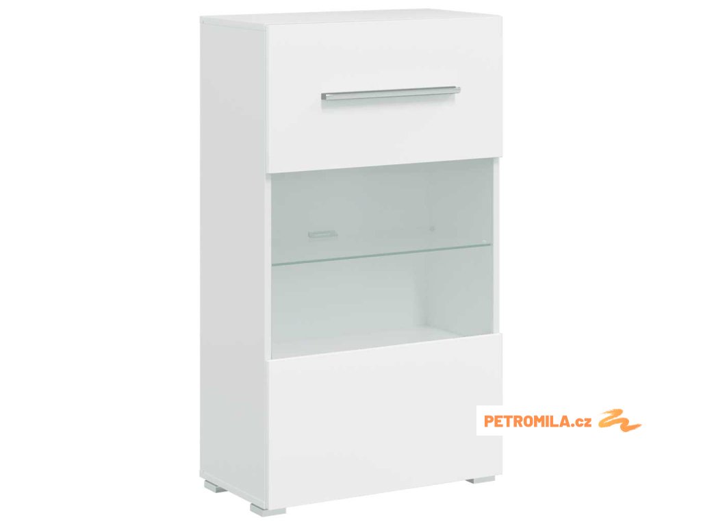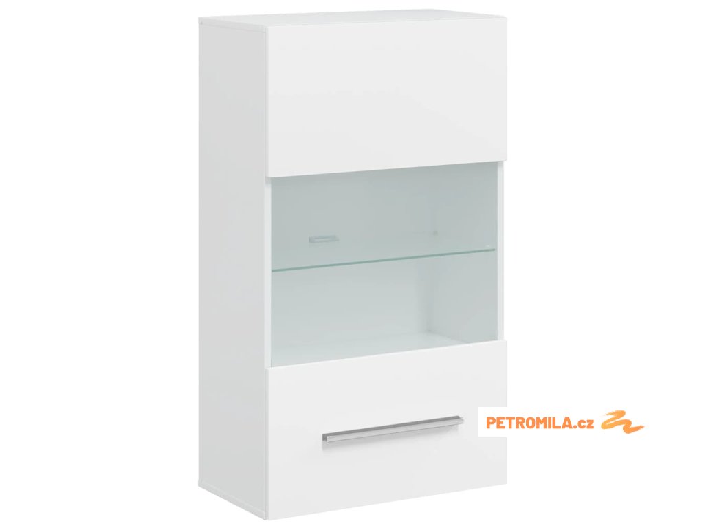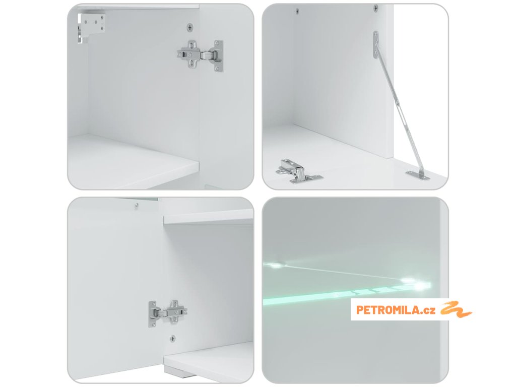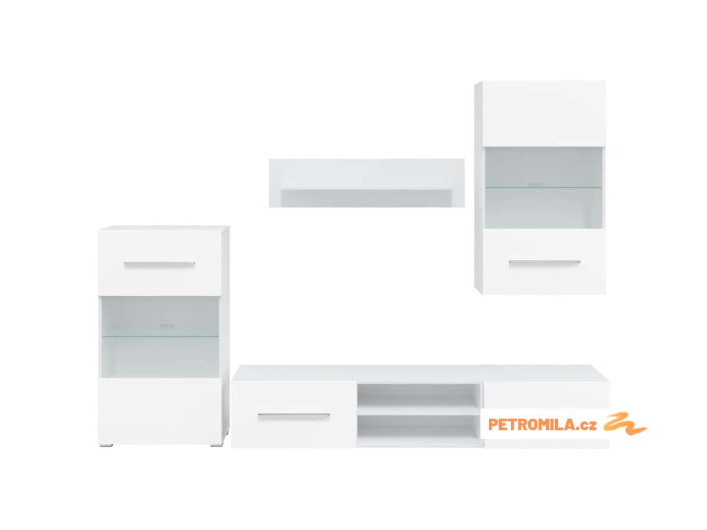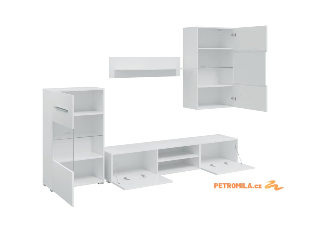 Sada, skládající se z nástěnné skříňky, samostatně stojící skříňky, dvou skříněk pod TV a nástěnné police, poskytuje dostatek prostoru pro ukládání multimediálních zařízení, knih a všech menších předmětů. Bude také ideální pro vystavení dekorativních předmětů, fotorámečků nebo dokonce i hrnkových rostlin. TV stolky s vyklápěcími dvířky poskytují dostatek místa, aby vaše knihy, různé potřeby, DVD přehrávač, nosiče médií atd. byly dobře uspořádané. Nástěnná skříňka a stojací skříňka jsou vybaveny jedněmi částečně prosklenými dvířky a třemi policemi, včetně jedné skleněné police s energeticky úsporným bílým LED osvětlením.
