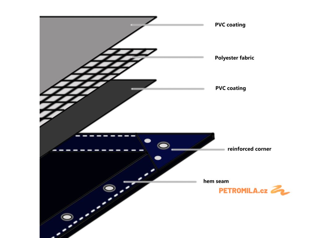 Plachta je vyrobena z vysoce kvalitní celtoviny s PVC povlakem, takže je odolná proti roztržení, vodě a UV záření a lze ji používat při teplotách od -30 °C do 70 °C. Plachta má v každém rohu a kolem okrajů očka pro snadné upevnění.