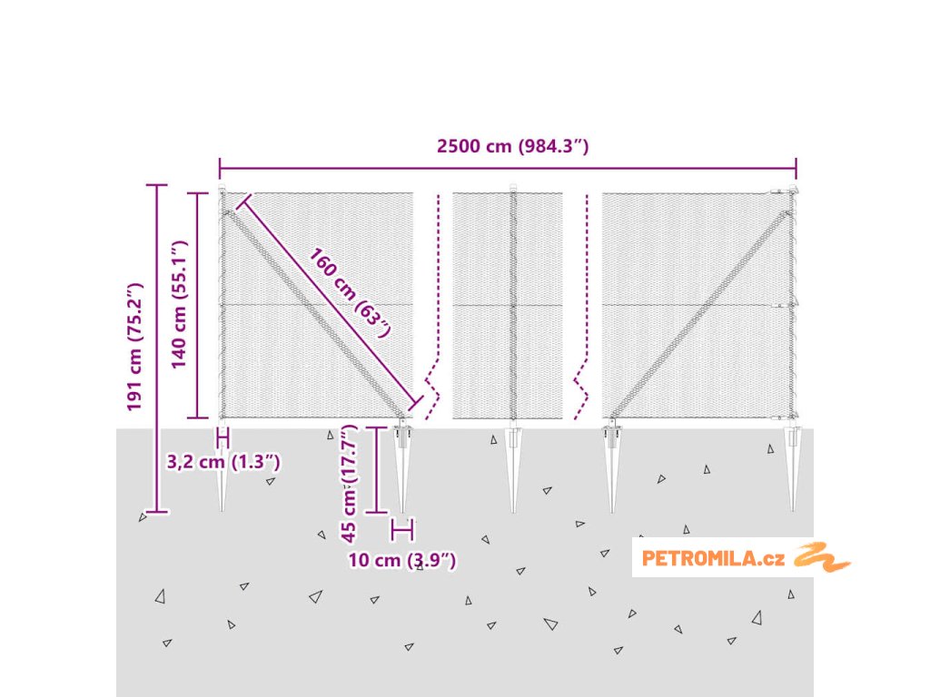 - Celkové rozměry: 2500 x 3.2 x 140 cm (D x Š x V)