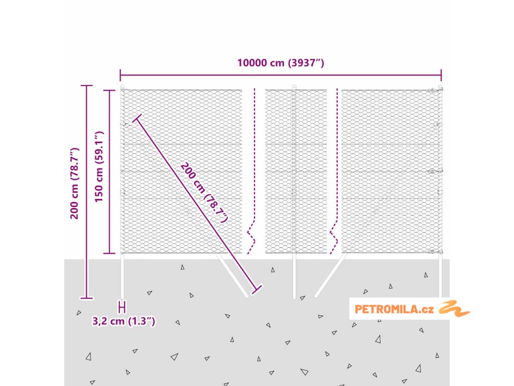 - Celkové rozměry: 10000 x 3.2 x 150 cm (D x Š x V)