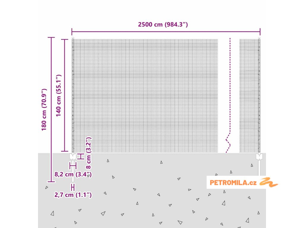 - Celkové rozměry: 2500 x 2,7 x 140 cm (D x Š x V)