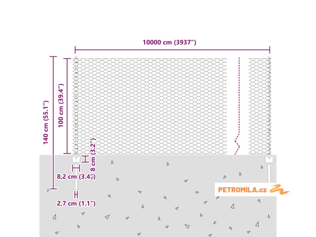 - Celkové rozměry: 10000 x 2,7 x 100 cm (D x Š x V)