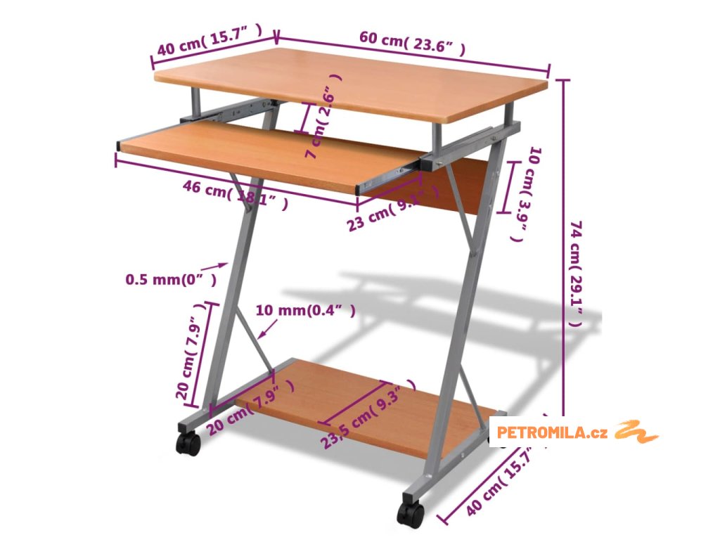 Prostorná pracovní plocha usnadňuje používání vašeho počítače a zároveň umožňuje také pohodlné čtení a psaní. Tento počítačový stůl má vysouvací desku pro klávesnici a spodní poličku, kam můžete umístit váš počítač nebo tiskárnu. PC stůl, vyrobený z dřevotřísky a práškově lakovaného ocelového rámu, vám jistě bude sloužit po dlouhá léta.