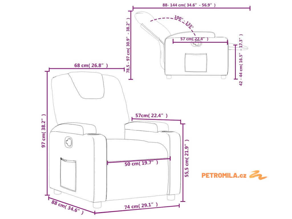 - Rozměry sklopeného křesla: 74 x 144 x 78,5 cm (Š x H x V)