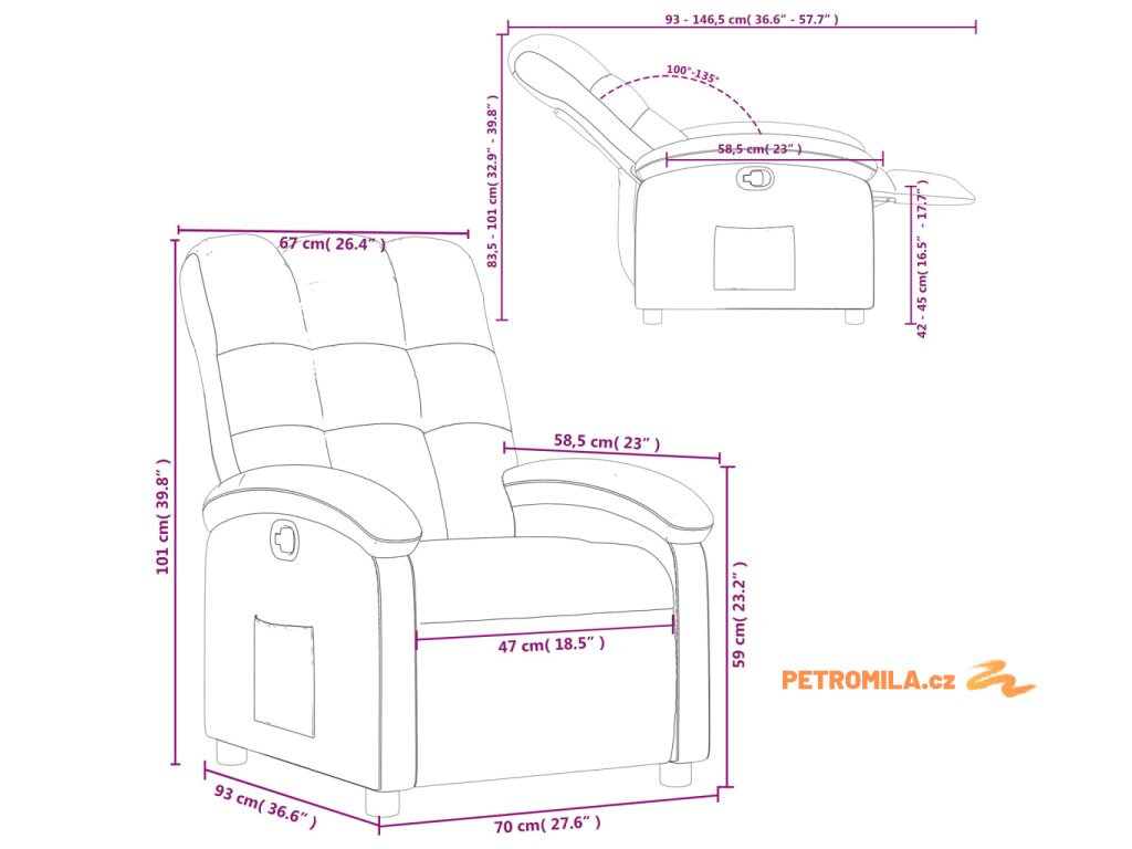 - Rozměry při poloze vsedě: 70 x 93 x 101 cm (Š x H x V)