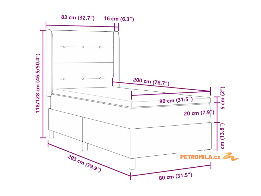 - Malé jednolůžko (80 cm x 200 cm nebo 31" x 79")
