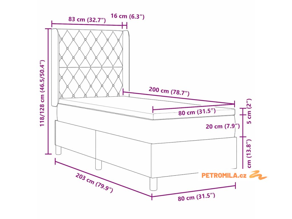 - Malé jednolůžko (80 cm x 200 cm nebo 31" x 79")