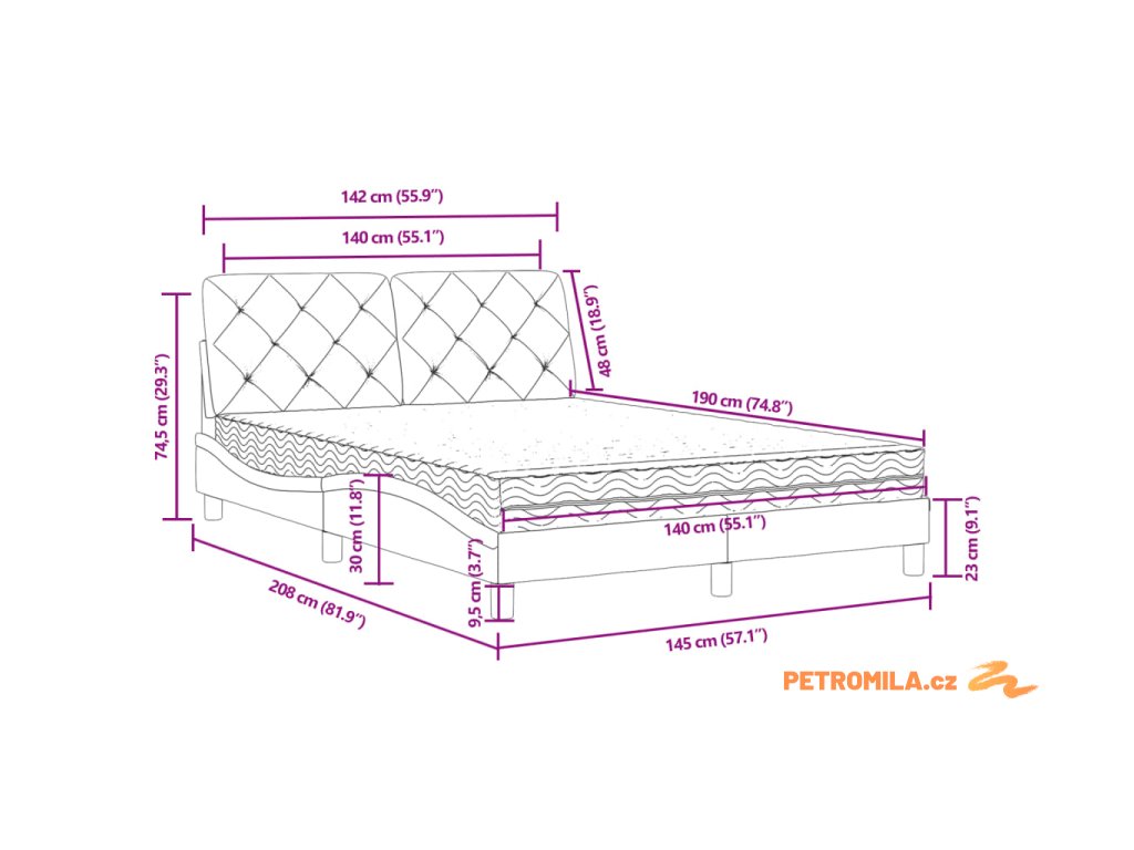 - Celkové rozměry: 208 x 145 x 74,5 cm (D x Š x V)