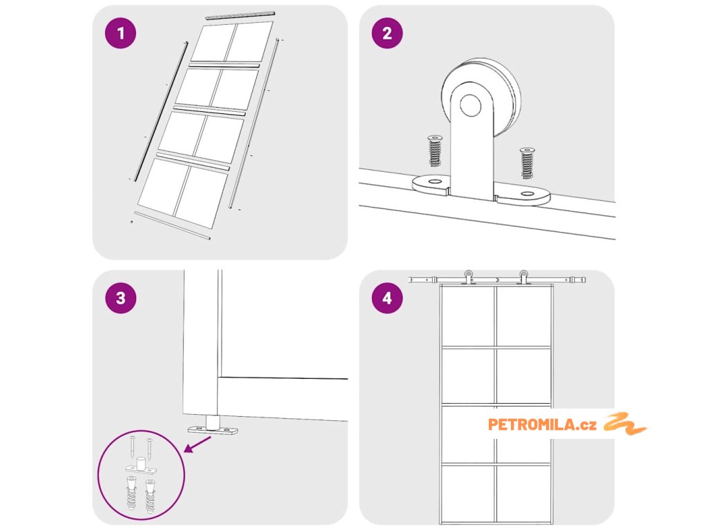 - Způsob instalace je vysvětlen v našem instalačním manuálu ke dveřím a sadám příslušenství.