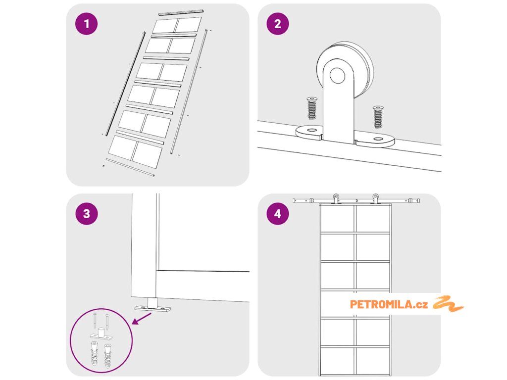 Dveře je možné nasadit pouze v kombinaci se setem kování pro posuvné dveře. Vhodné sety kování pro posuvné dveře najdete v našem obchodě (SKU: 145262–145263). Způsob montáže si můžete prohlédnout v našem instalačním manuálu pro dveře a set kování pro posuvné dveře.