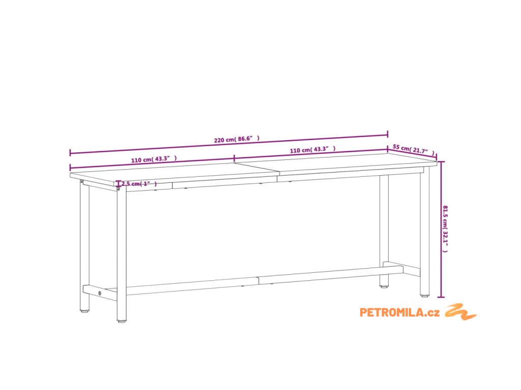 - Celkové rozměry: 220 x 55 x 81,5 cm (D x Š x V)