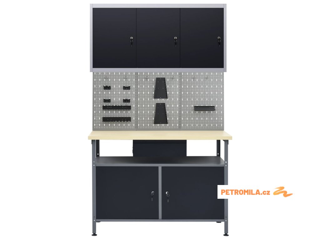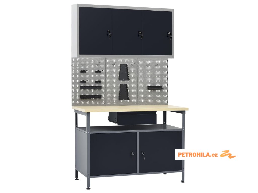 Tato dílenská sada 1 pracovního stolu se 3 nástěnnými panely a 1 nástěnnou skříňkou je praktické úložné řešení pro vaši dílnu a garáž.