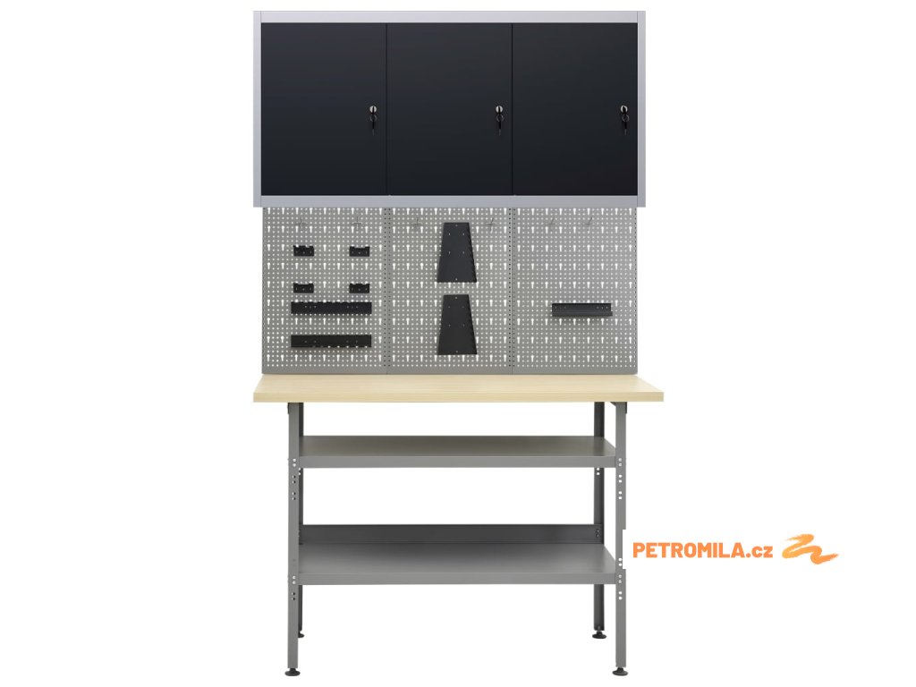 Tato dílenská sada 1 pracovního stolu se 3 nástěnnými panely a 1 nástěnnou skříňkou je praktické úložné řešení pro vaši dílnu a garáž.