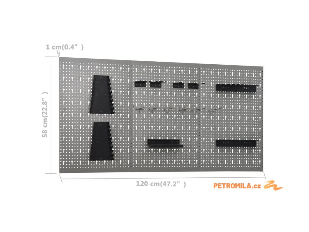Tyto panely do dílny na nářadí jsou vyrobené z masivní oceli a unesou váhu celé řady různých nástrojů, jako jsou vrtačky, kleště, šroubováky a klíče. Panely jsou děrované pro snadné a bezpečné zavěšení nástrojů. Tyto 3 nástěnné panely je možné spojit dohromady a vytvořit jeden velmi pevný celek. Je to ideální doplněk ponků a dílenských skříní s praktickou šířkou 120 cm.